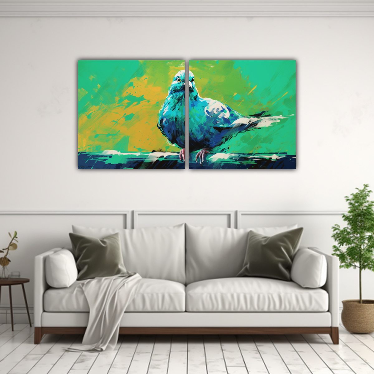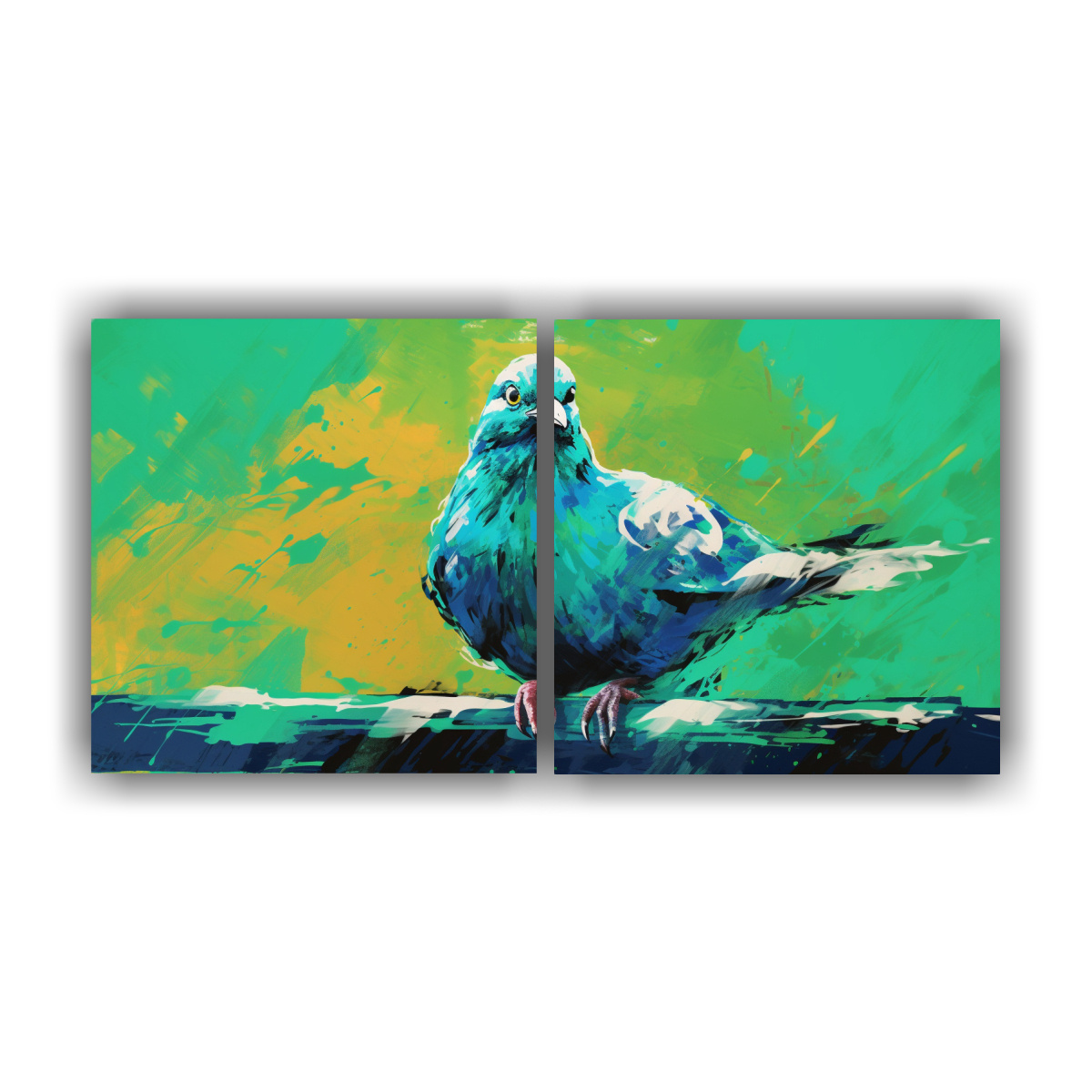Este set de lienzos con tema de paloma en verde y turquesa se vería espectacular en una pared blanca para resaltar sus colores vibrantes Colócalos en el living o en el dormitorio para darle un toque moderno y único a tu hogar