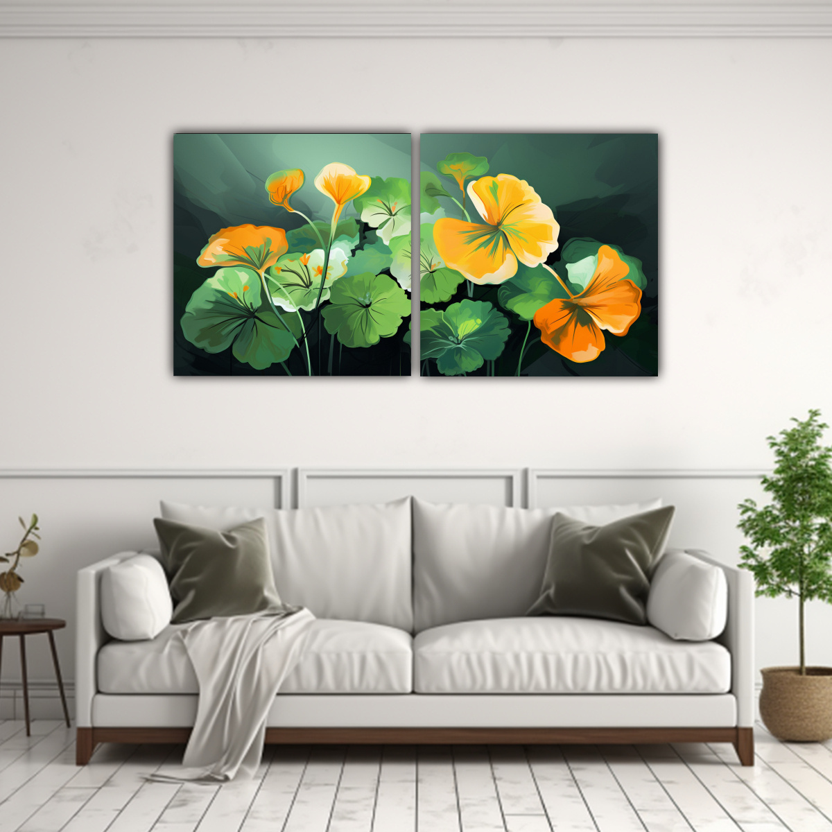 2 Pinturas De Arte Fino Tonos Fantásticos De Nasturtium Herbs En Colores Verde Y Naranja Neonoir En Decoración.