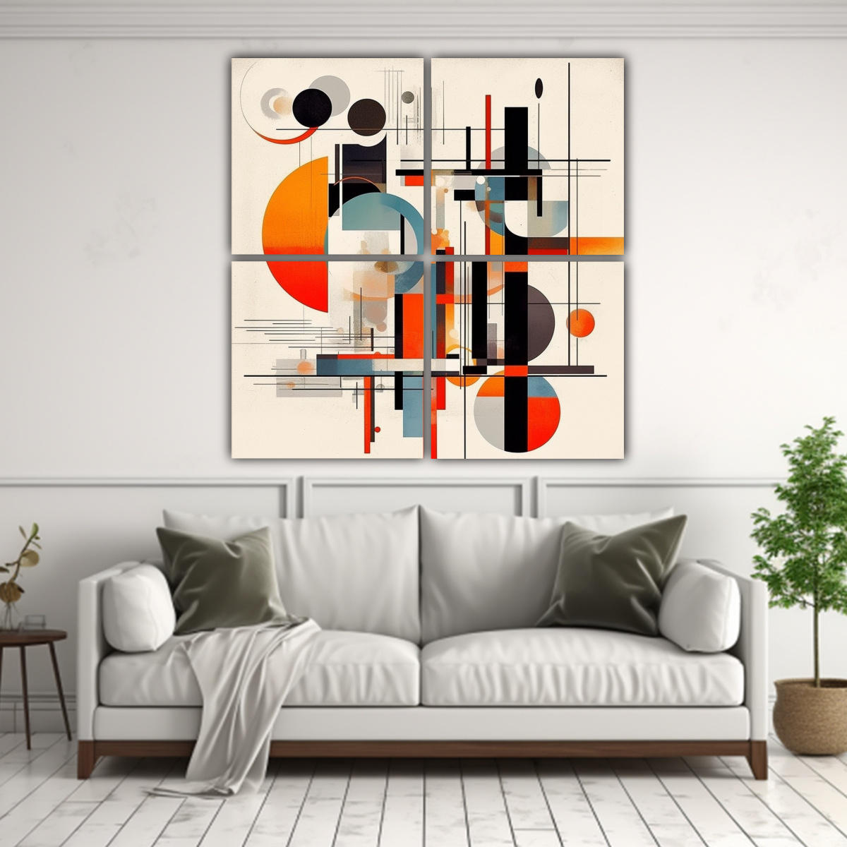 Descubre las 4 composiciones simétricas de este cuadro inspiradas en el movimiento Bauhaus y el estilo Art Nouveau, con un toque misterioso Azul Marino grisaceo, Rojo, Beige, Anaranjado, Gris y Plateado Impreso en alta calidad en tela con bastidores de madera Precios económicos y entrega rápida en Santiago Envíos express a regiones