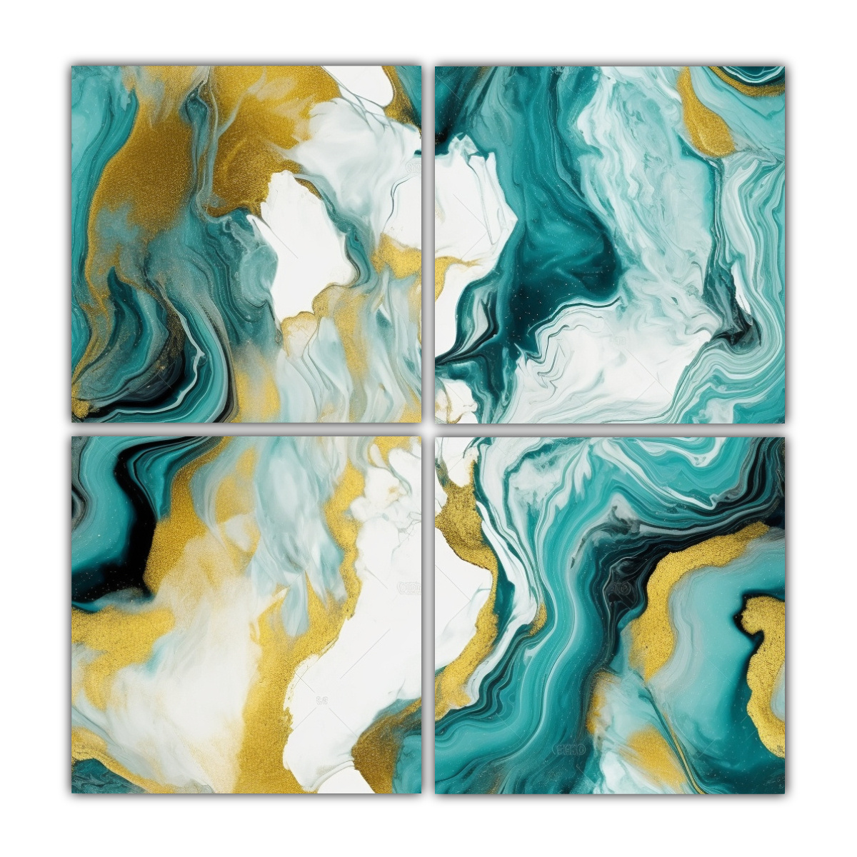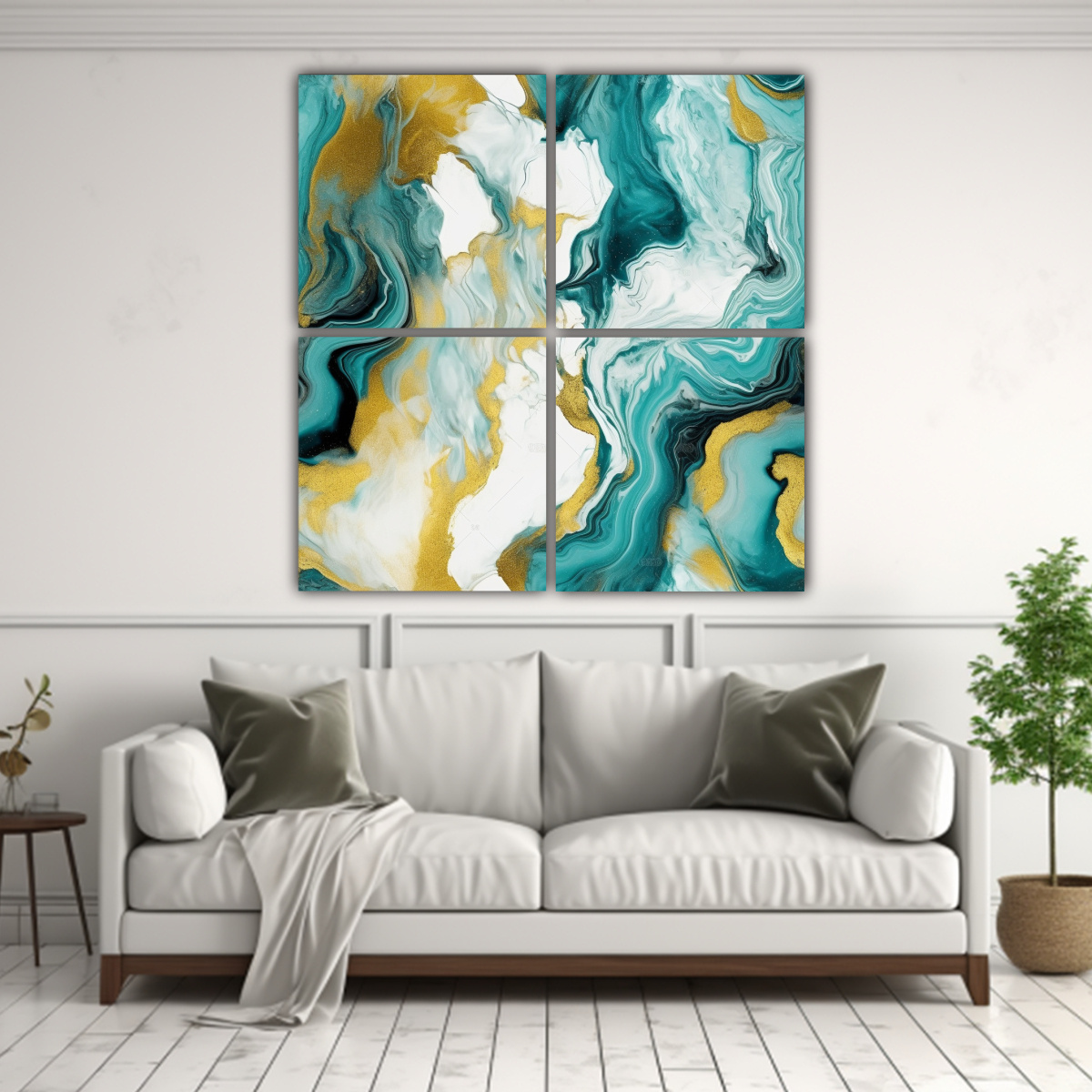 4 Lienzos Impreso Riqueza Visual En Fondo Azul Y Dorado, Estilo Abstracto