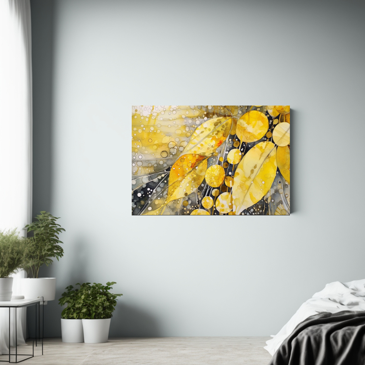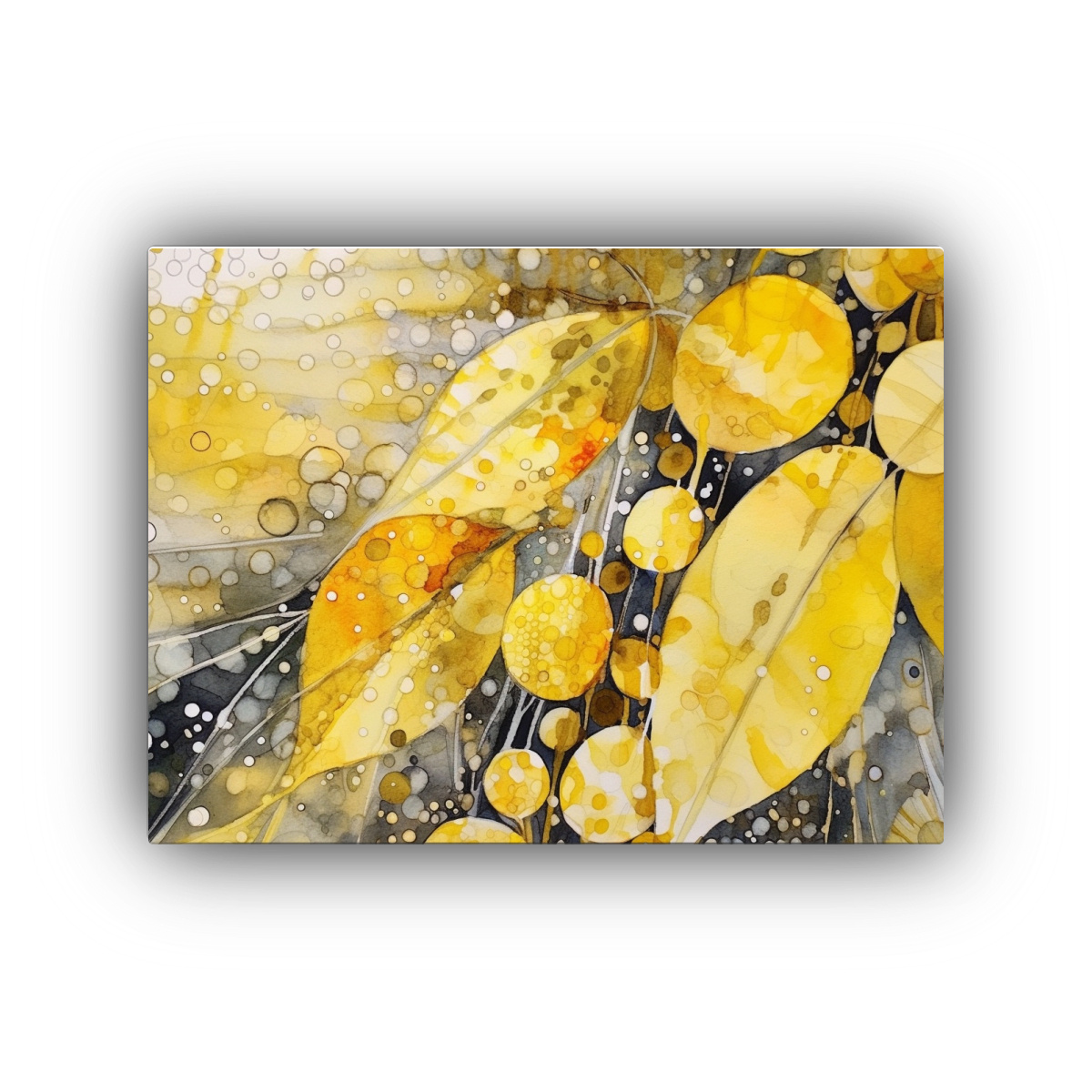 Coloca este cuadro de acuarela Shibori amarilla y blanca en tu sala de estar junto a muebles de tonos neutros para crear un contraste elegante y moderno Combínalo con cojines en colores mostaza y gris para lograr un ambiente acogedor y sofisticado