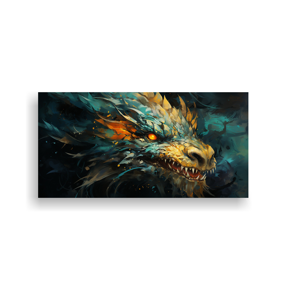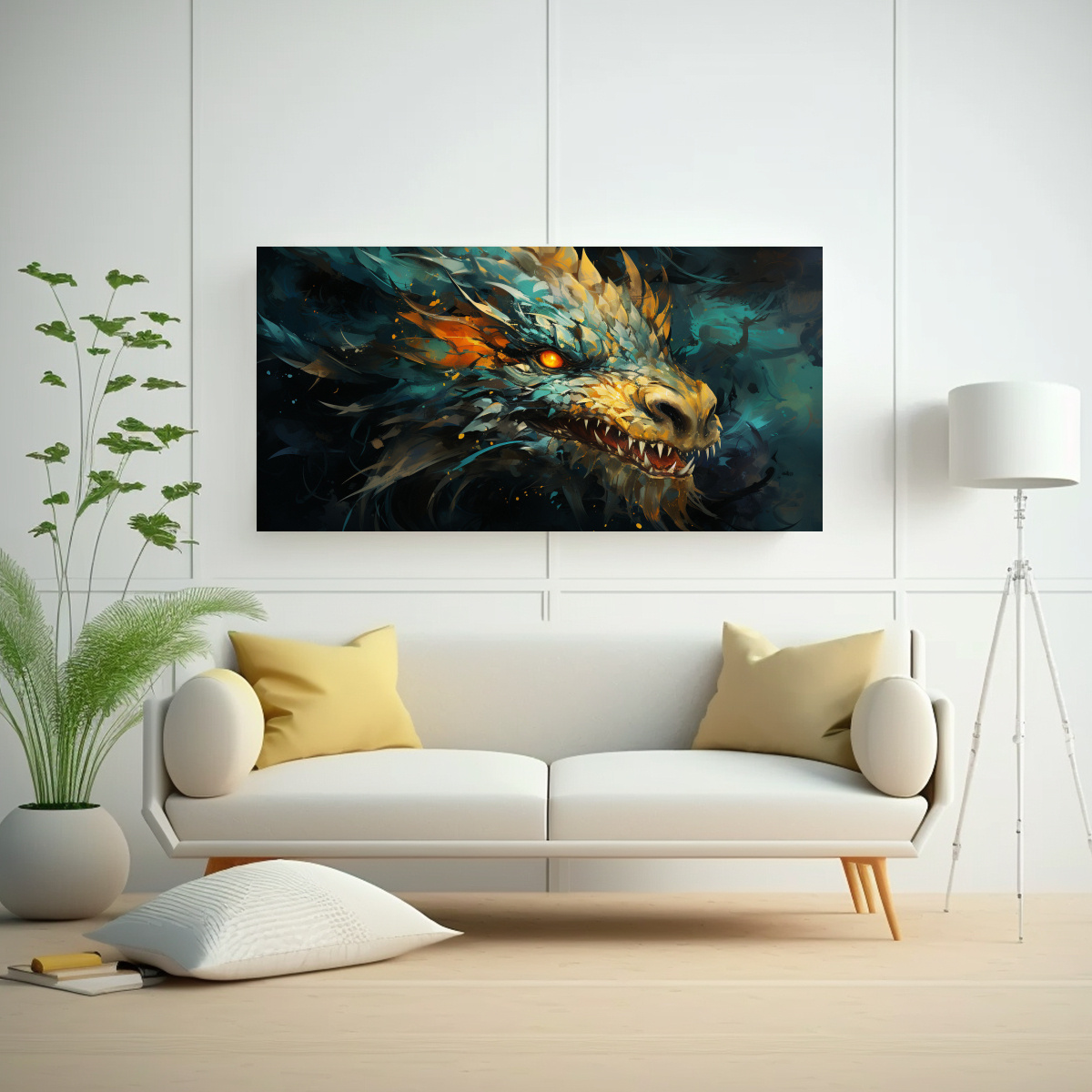 Este cuadro ‘Adorno Moderno: Dragón en Verde y Oro, Atmosfera Neonoir’ es ideal para colocar en tu sala de estar, creando un ambiente sofisticado y enigmático Combínalo con muebles en tonos oscuros y detalles en plateado para resaltar su diseño exclusivo y moderno