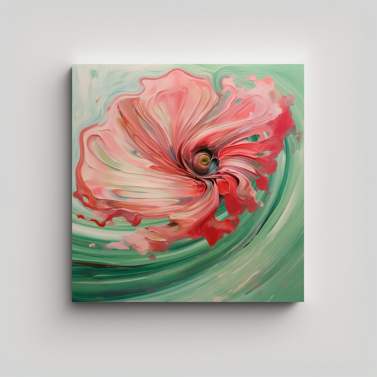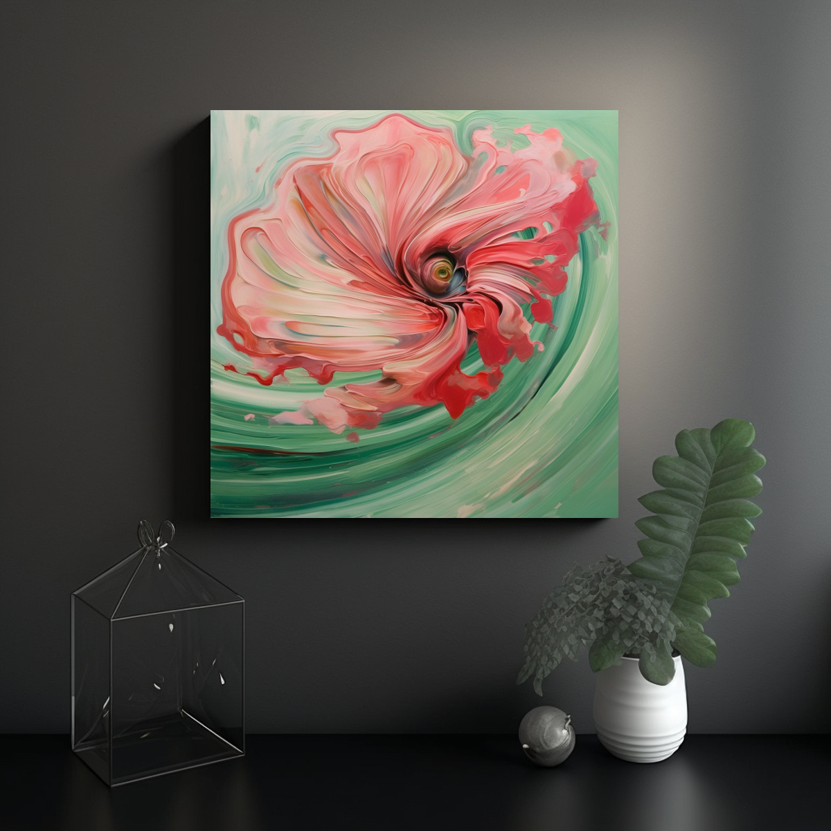 Este cuadro abstracto en lienzo grande de color verde con toques creativos en rosa sería perfecto para destacar en el salón, sobre un sofá de tonos neutros, aportando frescura y modernidad Complementa con cojines en tonos similares para una decoración armónica
