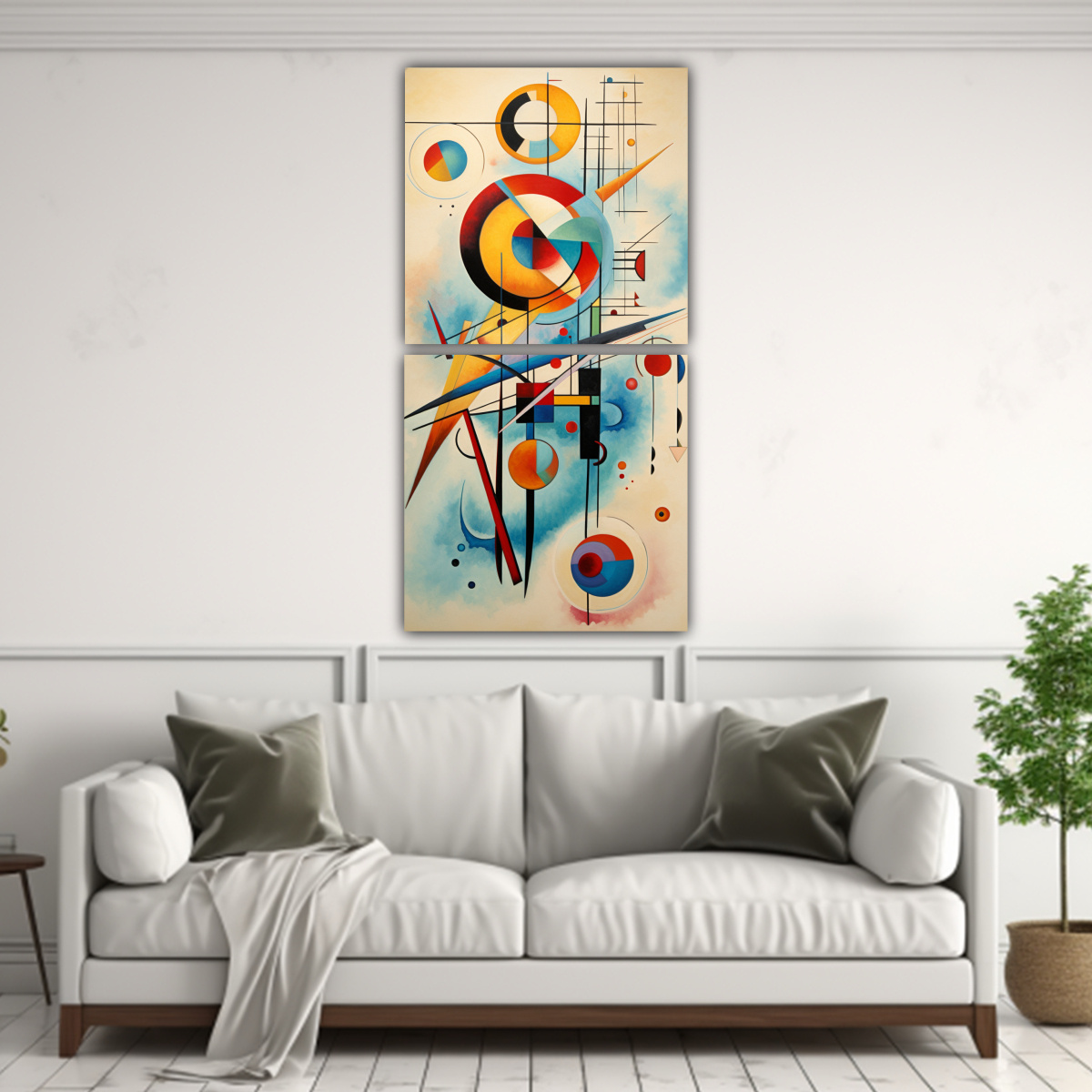 Este set de lienzos abstractos Kandinsky se vería perfecto en la sala de estar, sobre un sofá de color neutro Agrega cojines en tonos plateados y grises para resaltar los detalles intrincados de los cuadros Combínalos con una alfombra en tonos carmesí y turquesa para crear un ambiente moderno y elegante ¡Sorprende a tus invitados y disfruta de una decoración única!