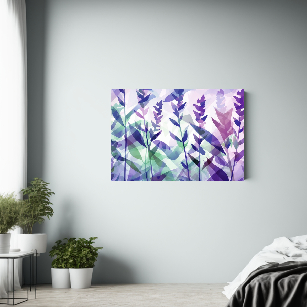 Este cuadro ‘Arte abstracto: Lavanda en formas geométricas’ sería perfecto para decorar un dormitorio o una sala de estar con tonos suaves Colócalo sobre un mueble blanco para resaltar los colores del cuadro y crear un ambiente relajante y moderno