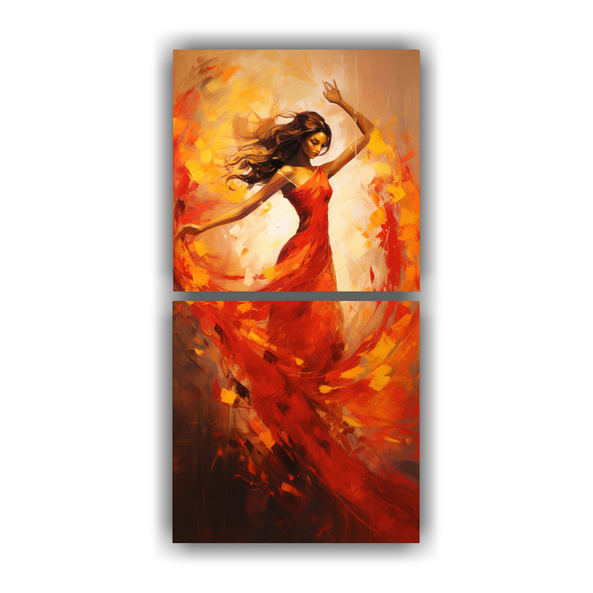 DecoCuadros ofrece este hermoso cuadro de arte acuarela que representa la vibrante electricidad de un número de baile de Bollywood Los colores predominantes son negro, carmesí y amarillo claro, junto con toques de chocolate, coral, beige, lila y plateado