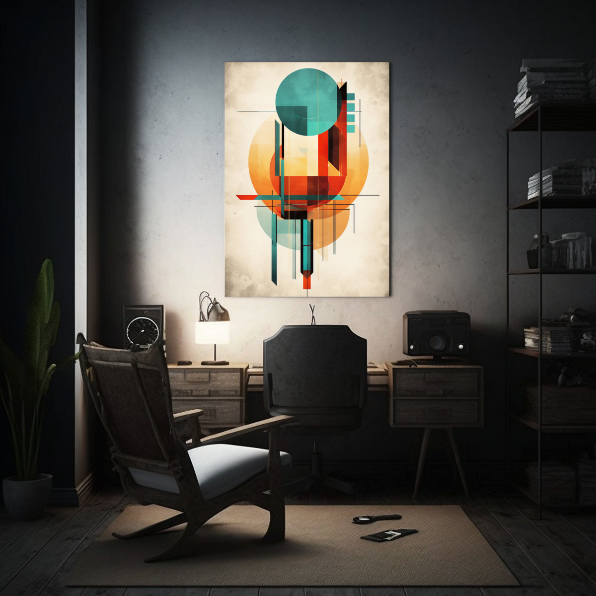 Este cuadro se vería increíble en un salón moderno o en una oficina creativa Sus colores Azul Marino grisaceo, Beige, Carmesi, Coral, Plateado, Turquesa y Gris se complementan perfectamente con muebles y decoración en tonos neutros Colócalo en una pared vacía para agregar un toque de arte y estilo a tu espacio ¡No te pierdas la oportunidad de tener esta obra de arte abstracta en tu hogar!