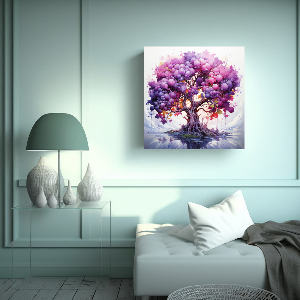 Este cuadro abstracto de árbol de frutas en colores morados se vería espectacular en una sala de estar moderna Puedes colocarlo sobre un sofá de color neutro y complementarlo con cojines en tonos morados y grises Además, puedes añadir una alfombra en tonos beige y lila para crear una combinación armoniosa ¡No dudes en darle a tu hogar un toque de creatividad y estilo con este hermoso cuadro de DecoCuadros!
