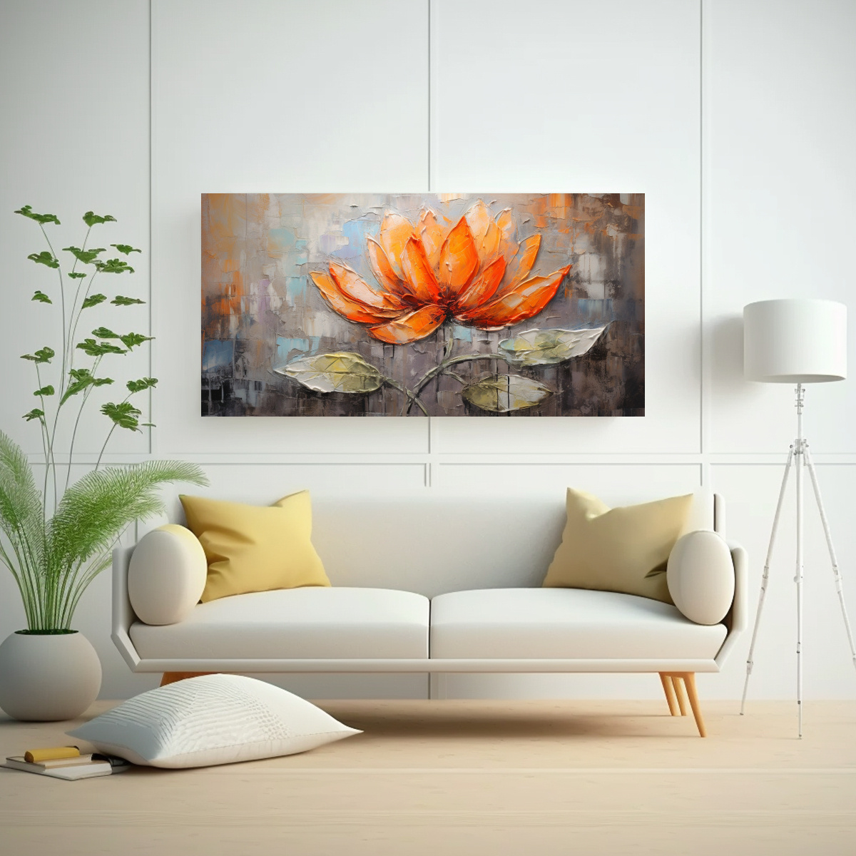 Este cuadro de loto naranja en lienzo al estilo de es ideal para decorar tu comedor Colócalo sobre una pared de color neutro, como blanco o gris claro, para que resalte y se convierta en el centro de atención Combínalo con muebles de tonos cálidos, como madera oscura o chocolate, y accesorios en colores dorados o plateados para crear un ambiente elegante y sofisticado ¡Atrévete a darle vida a tus paredes con este hermoso cuadro!