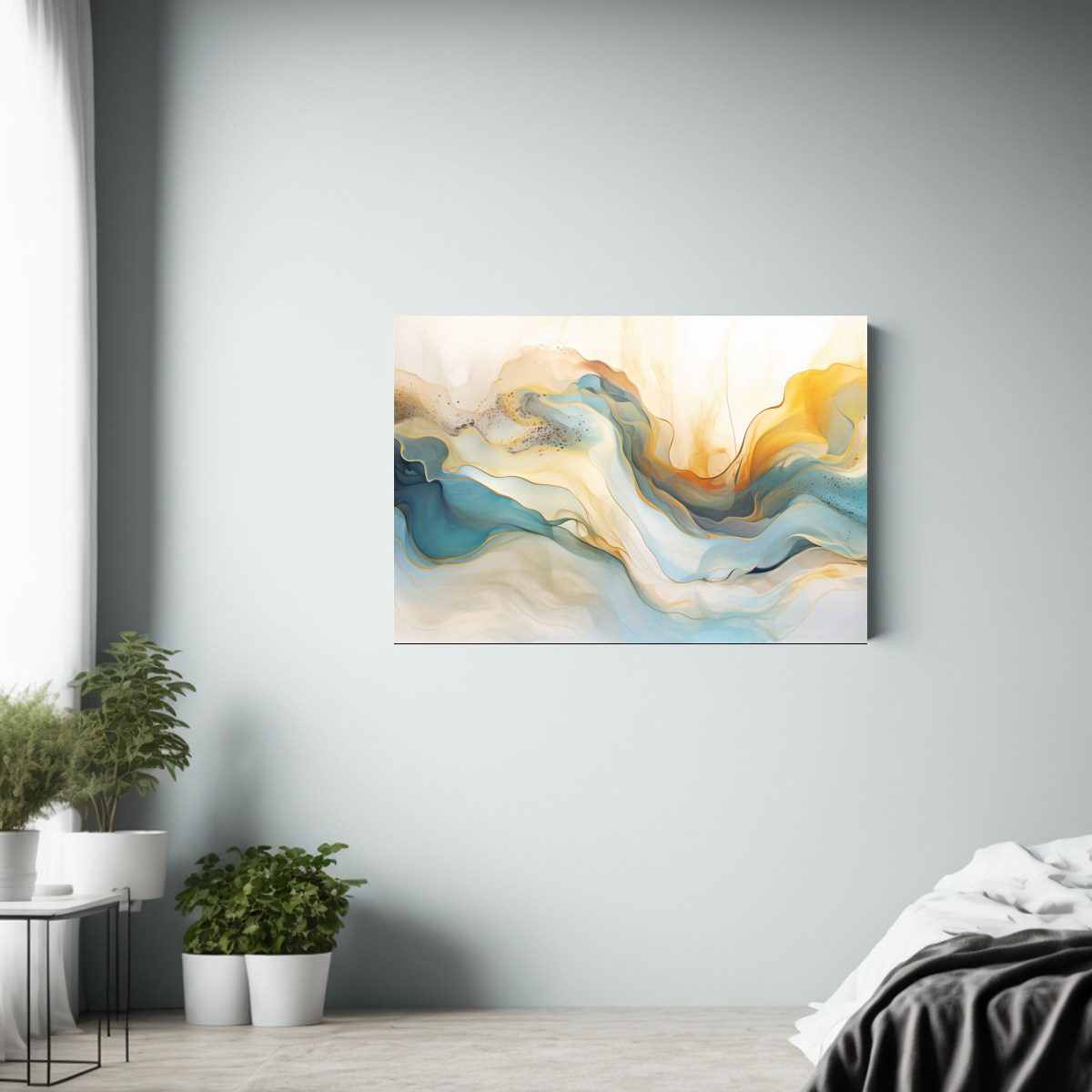 Este cuadro Arte de Pared Perspectiva Acuarela con Oro y Plata sería ideal para colocar en la sala de estar sobre un sofá beige, complementando con cojines en tonos turquesa y plateado Aportará elegancia y sofisticación a tu ambiente