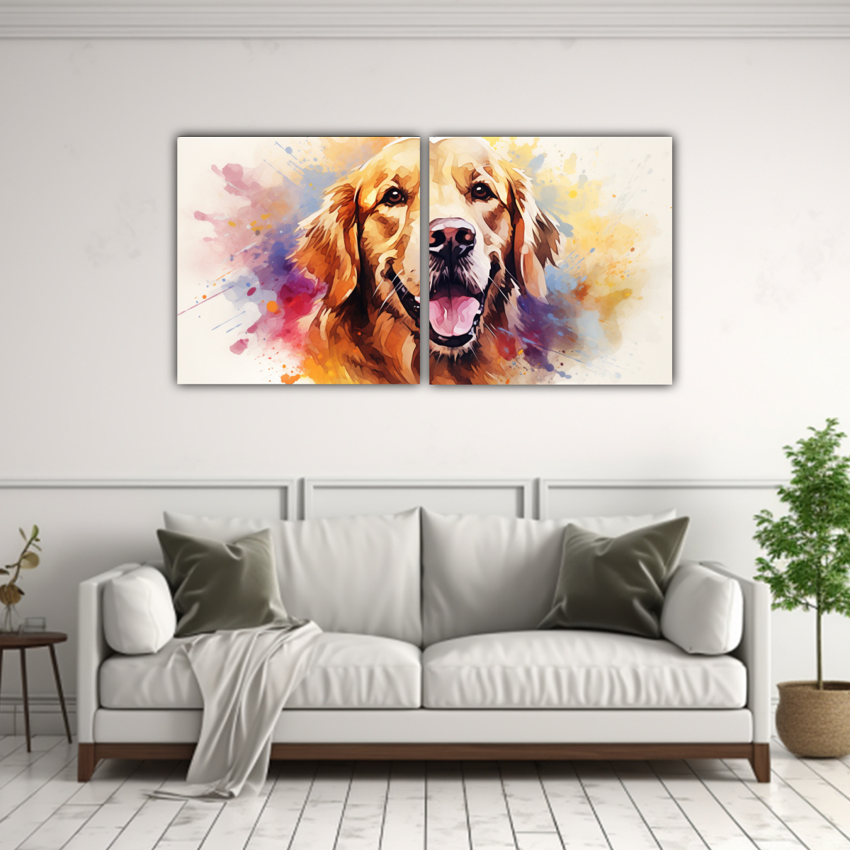 Coloca el cuadro Retriever Acuarela Colorida en tu sala de estar para darle un toque de sofisticación Combínalo con muebles en tonos neutros para resaltar su belleza y crear un ambiente armonioso y acogedor