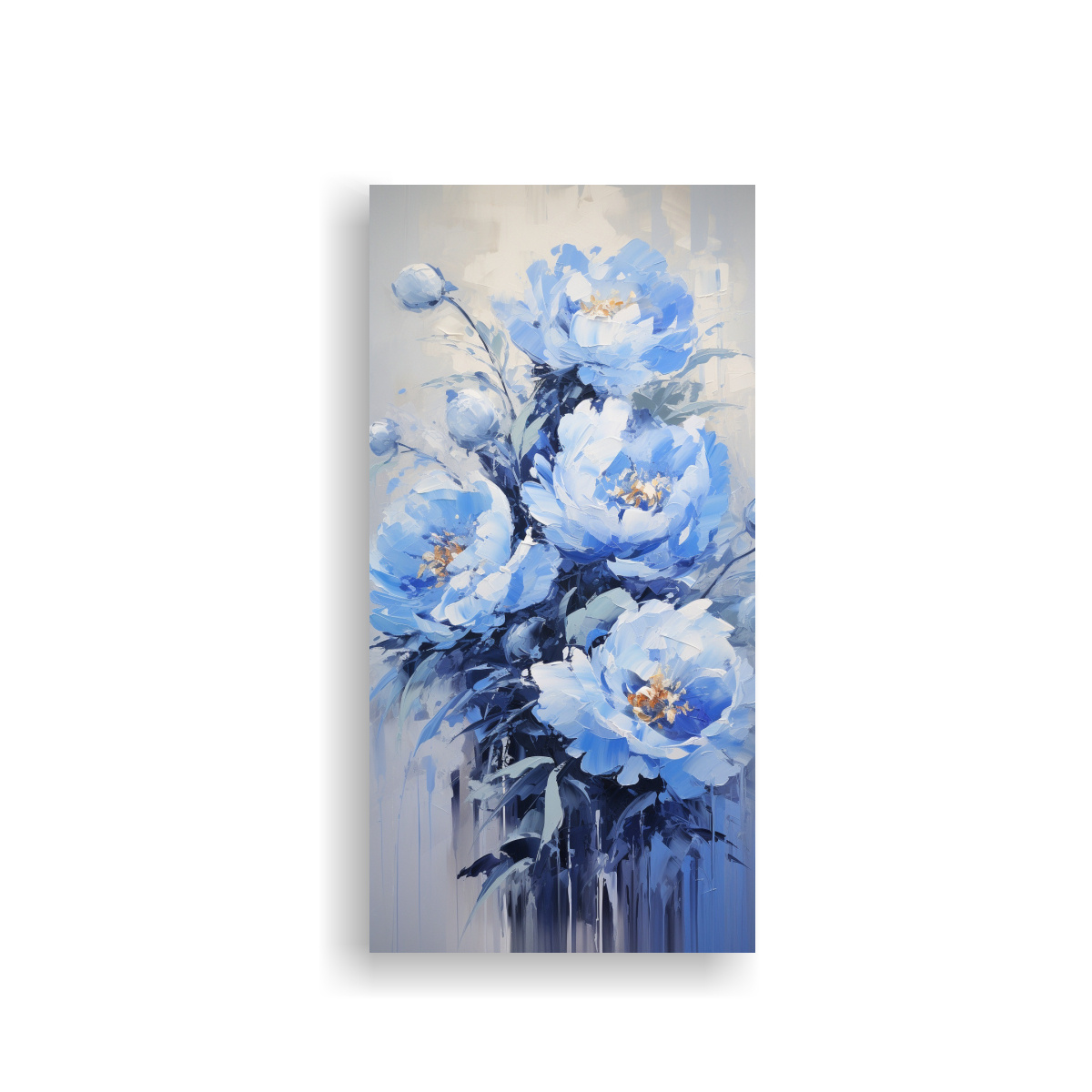 DecoCuadros ofrece el cuadro ‘Arte de Peonías Azules Estilo Equilibrio Visual Tela en Bastidor’, una impresión en tela de alta calidad con colores plateado, azul marino grisaceo, gris, beige, dorado y turquesa Diseño exclusivo y envío rápido y gratuito en Santiago