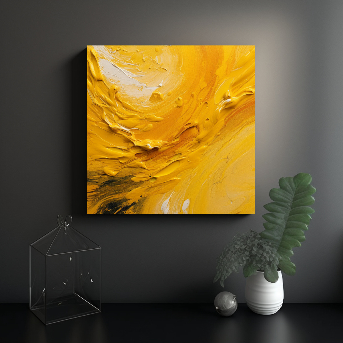 Este cuadro abstracto en colores mostaza sería ideal para colocar en la sala de estar, sobre un mueble de tonos neutros para resaltar su belleza y crear un punto focal en la habitación También puedes combinarlo con cojines, mantas o cortinas en tonos similares para lograr una decoración armoniosa y elegante