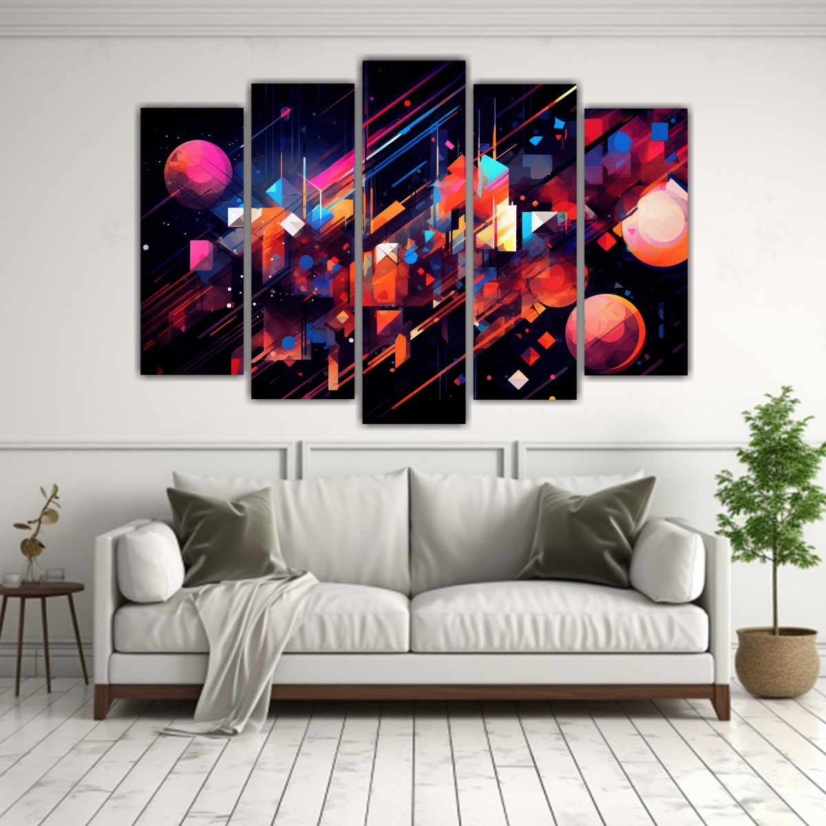 Este Cuadro Abstracto Geométrico de Alta Contraste sería perfecto para realzar la elegancia de tu sala de estar Colócalo sobre un sofá gris para que los tonos vibrantes resalten y creen un ambiente sofisticado y moderno ¡Impresiona a tus invitados con esta pieza única!