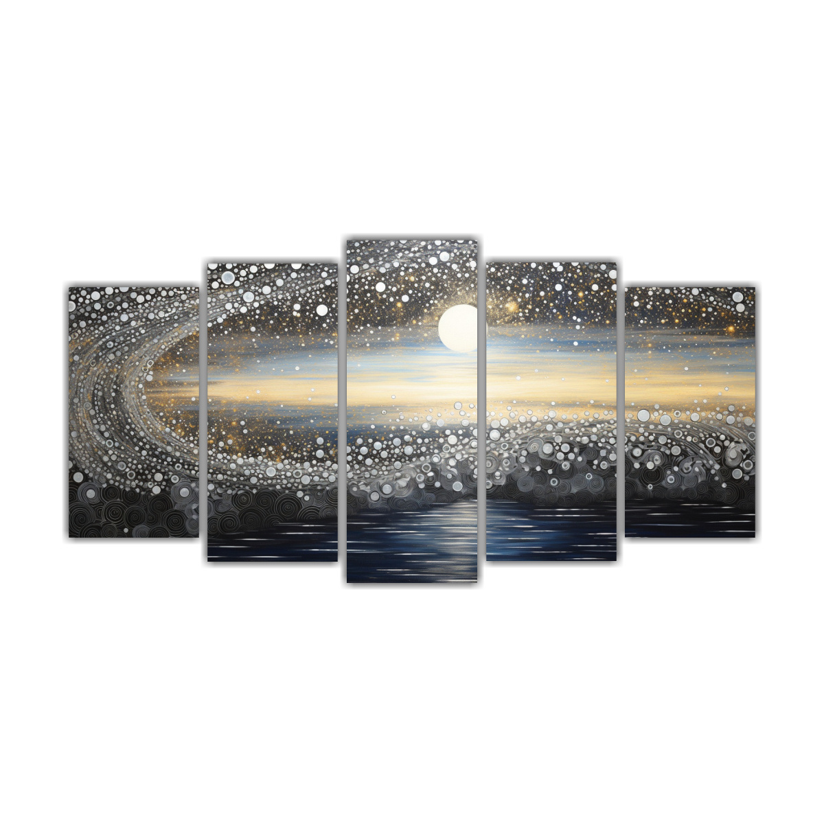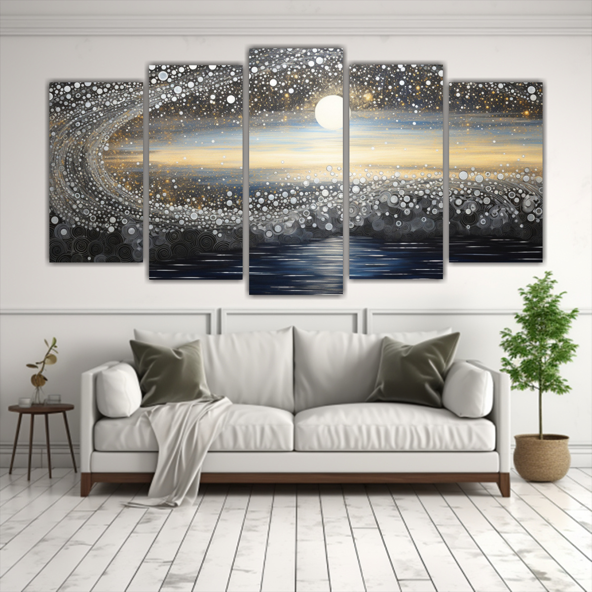 DecoCuadros ofrece cinco telas artesanales en bastidor con un impresionante estilo de puntillismo luminoso en tonos de azul marino grisaceo, plateado, gris y coral Nuestros cuadros decorativos impresos en tela de alta calidad con bastidores de madera son perfectos para añadir un toque de elegancia y sofisticación a cualquier espacio Con diseños exclusivos y los precios más económicos del mercado, en DecoCuadros encontrarás la mejor calidad y una entrega rápida y gratuita en Santiago, con envíos express a regiones
