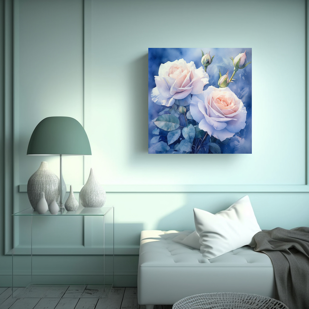Añade estilo a tus espacios con este Arte Único: una espectacular rosa azul pastel en un fondo delicado Nuestros cuadros decorativos impresos en tela de alta calidad con bastidores de madera son ideales para darle un toque de calidez y belleza natural a cualquier ambiente Tenemos la mejor calidad del mercado y precios económicos ¡Compra ahora y recibe tu cuadro en Santiago en tiempo récord!