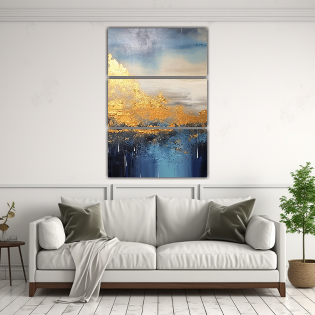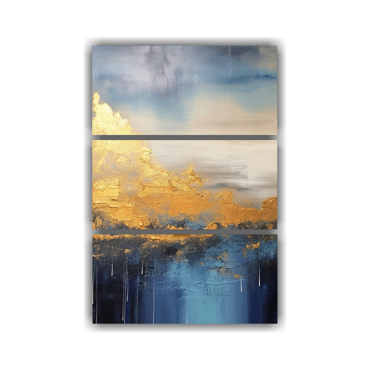 Arte Vidrio Acrílico Abstracto Amanecer, Patrón Intenso, Conjunto De 3 Composiciones En Tonos Azules Y Dorados
