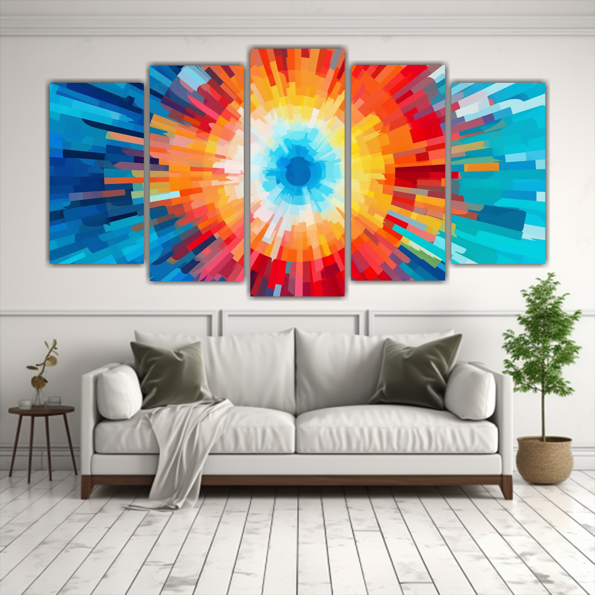 Este Cuadro Movimiento Unica sería perfecto para decorar una sala de estar moderna Puedes colocarlo como pieza central en una pared blanca para resaltar sus colores vibrantes Combínalo con muebles en tonos neutros como gris claro y blanco para crear un contraste elegante También puedes complementarlo con cojines y accesorios en los mismos tonos de verde azulado, plateado, coral, gris, carmesí, azul marino grisáceo, turquesa y cian para lograr una armonía visual en tu espacio