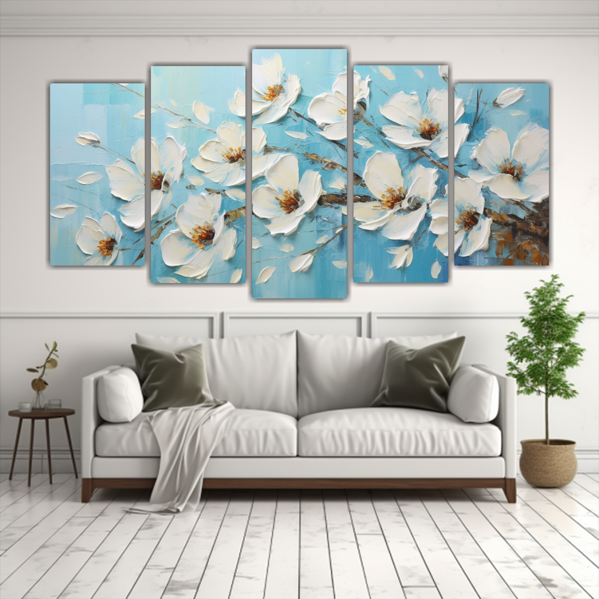 Adorna tu hogar con el cuadro ‘Cinco Lienzos De Tela Hermoso Bastidor de Madera’ con una impresionante pintura de flores blancas y turquesas Nuestros cuadros son exclusivos de nuestra tienda y ofrecen la mejor calidad a precios asequibles Realizamos entregas rápidas y gratuitas en Santiago y envíos express a regiones Compra ahora y transforma tu espacio