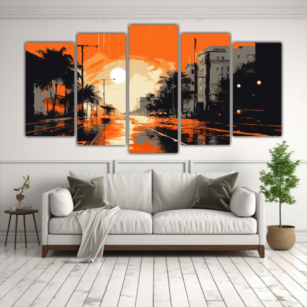 Este cuadro ‘Cinco lienzos tela Santiago: Naranja Neonoir’ sería perfecto para decorar un salón moderno o una oficina creativa Colócalo sobre un sofá gris para resaltar los tonos naranja y crear un ambiente sofisticado