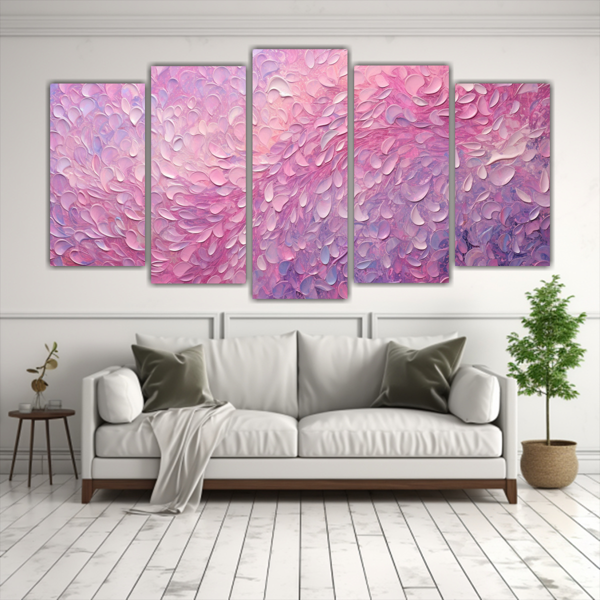 Este cuadro acuarela estilo puntillismo luminoso en lila, morado, beige, gris y rosado claro sería perfecto para decorar una sala de estar elegante Puede colocarse sobre un sofá de tonos neutros para crear un contraste llamativo También se vería bien en una habitación con muebles en tonos grises y blancos para agregar un toque de color suave y delicado