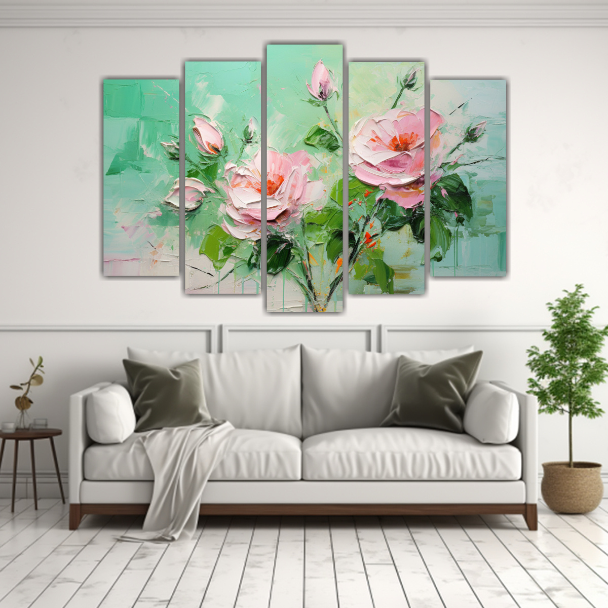 Cinco Telas En Bastidor Decorativo Con Flores En Verde Y Rosa