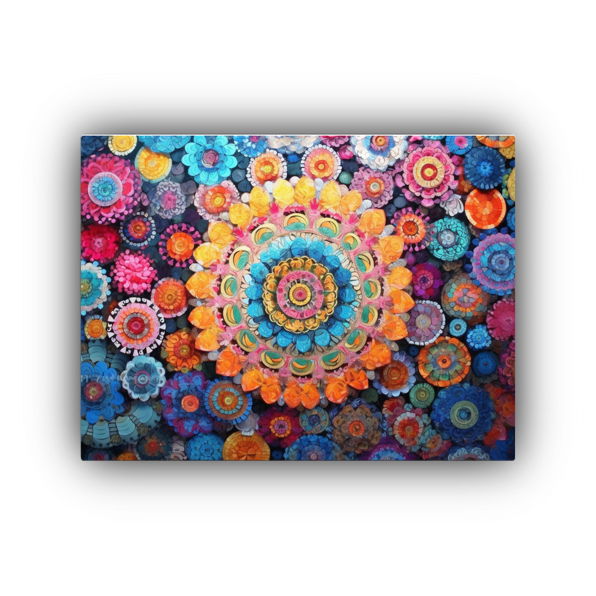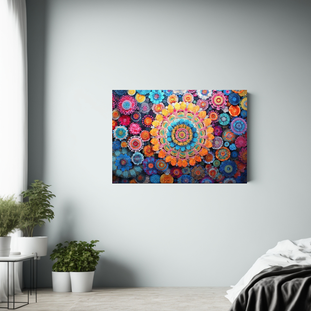 Para potenciar la belleza de este cuadro mandala, te recomendamos colocarlo en una pared blanca para resaltar sus vibrantes colores Combínalo con muebles en tonos neutros como beige o gris para crear un ambiente equilibrado y chic