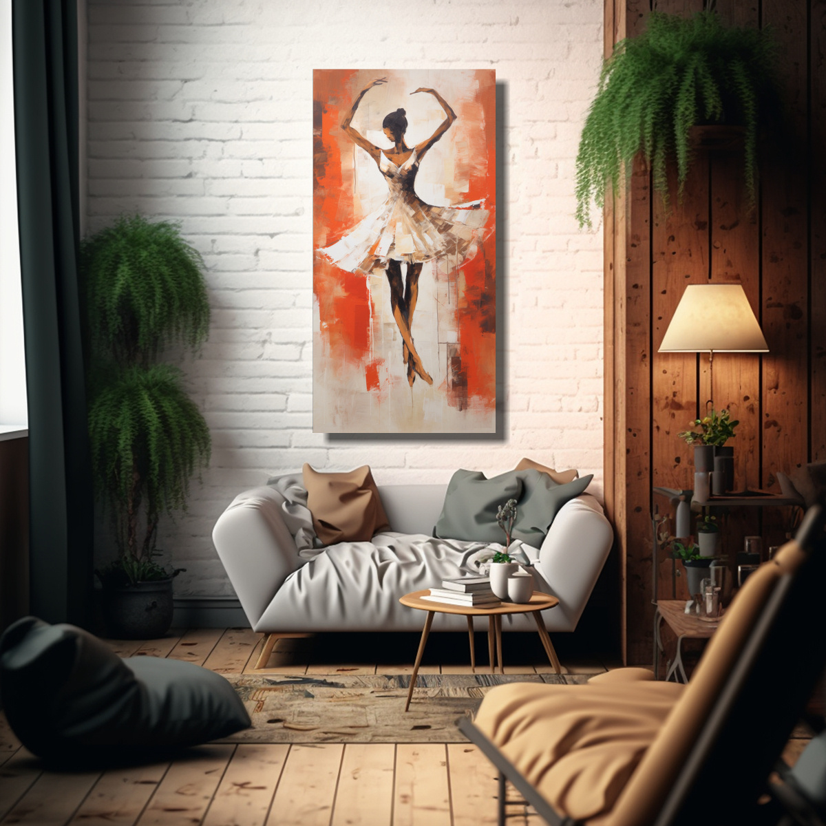DecoCuadros te ofrece la Composición abstracta de bailarina en estilo galería, con colores carmesí, azul marino grisáceo, plateado, coral, beige, gris y rosado claro; el toque perfecto para tu espacio