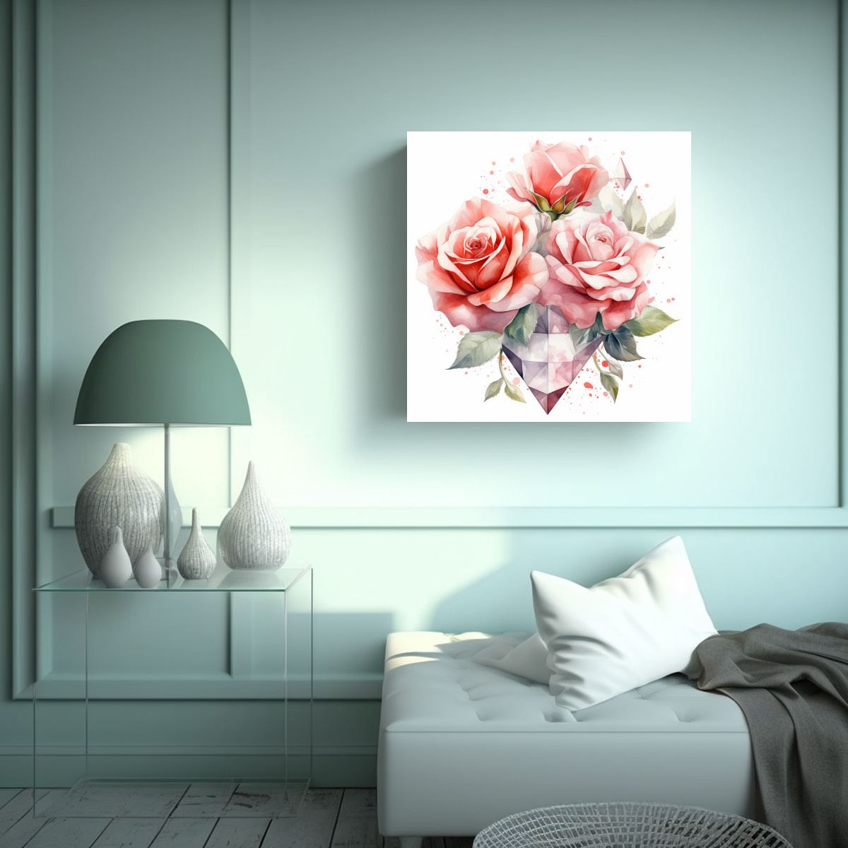Composición Armoniosa De Rosas En Acuarela Y Diamantes En Tela Bastidor