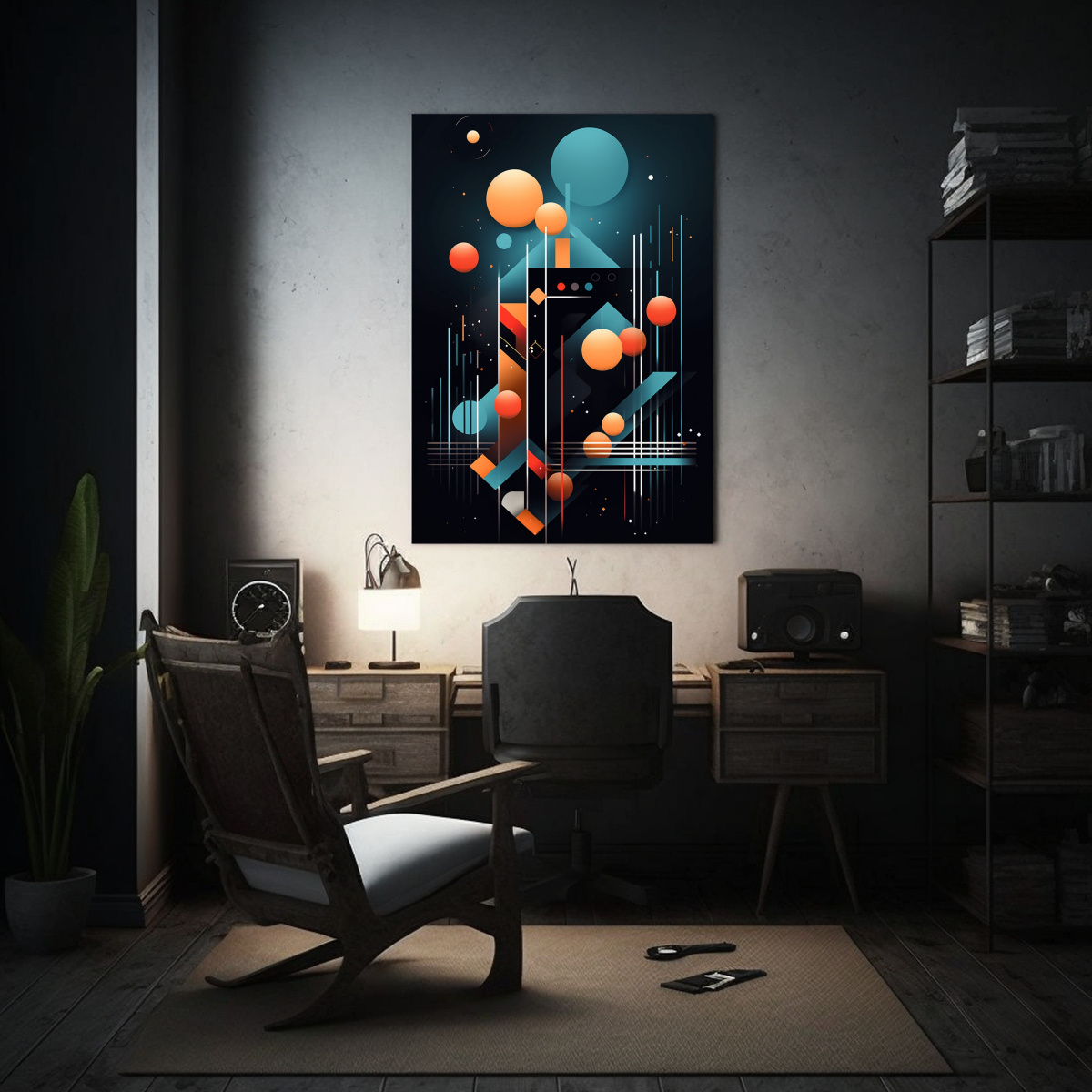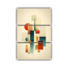 Este cuadro geométrico minimalista en tonos menta, coral y negro se vería espectacular en tu sala de estar, creando un contraste moderno y sofisticado en la pared principal Combínalo con muebles de líneas rectas y colores neutros para resaltar aún más su diseño futurista