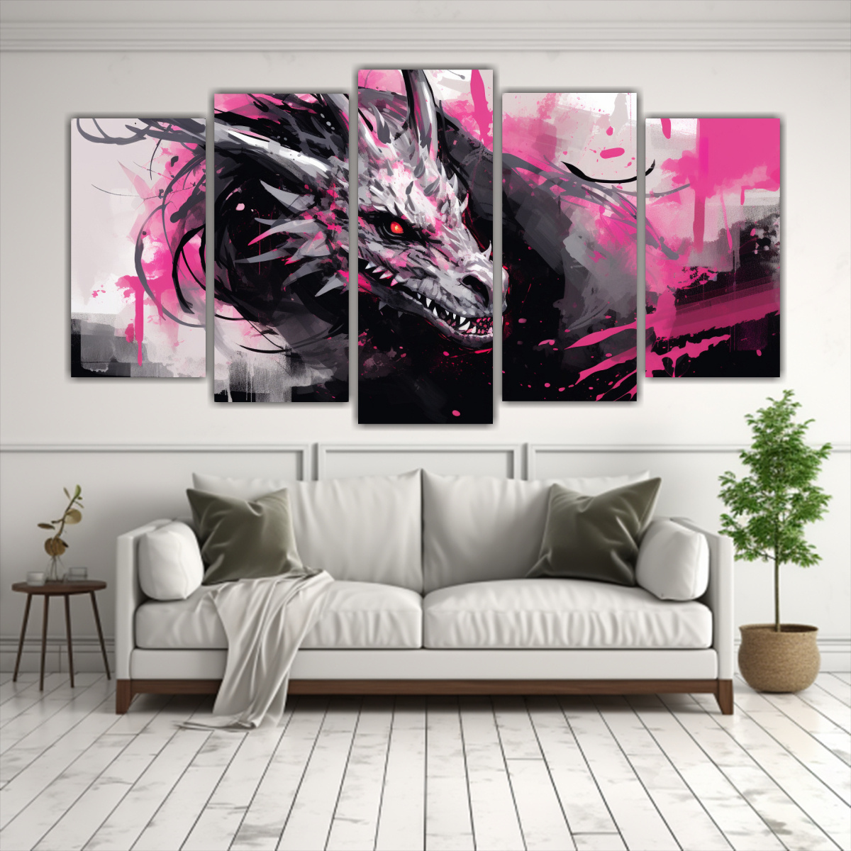 Para resaltar la esencia neonoir de este cuadro, te recomendamos colocarlo en una sala de estar moderna con tonos oscuros como negro, gris y azul marino Combínalo con muebles minimalistas y detalles en tonos coral para crear un ambiente sofisticado y vanguardista ¡El dragón en negro y rosa será el centro de atención de tu decoración!