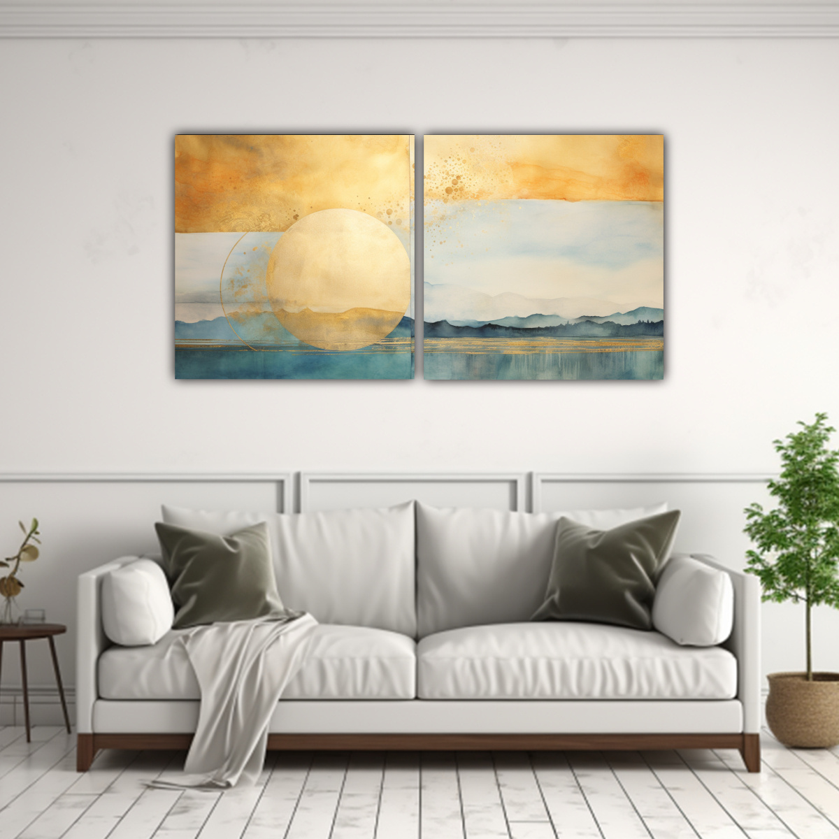 Conjunto 2 Lienzos Imagen Hogar Deco Pintura Arcoíris Acuarela Turquesa Y Dorada