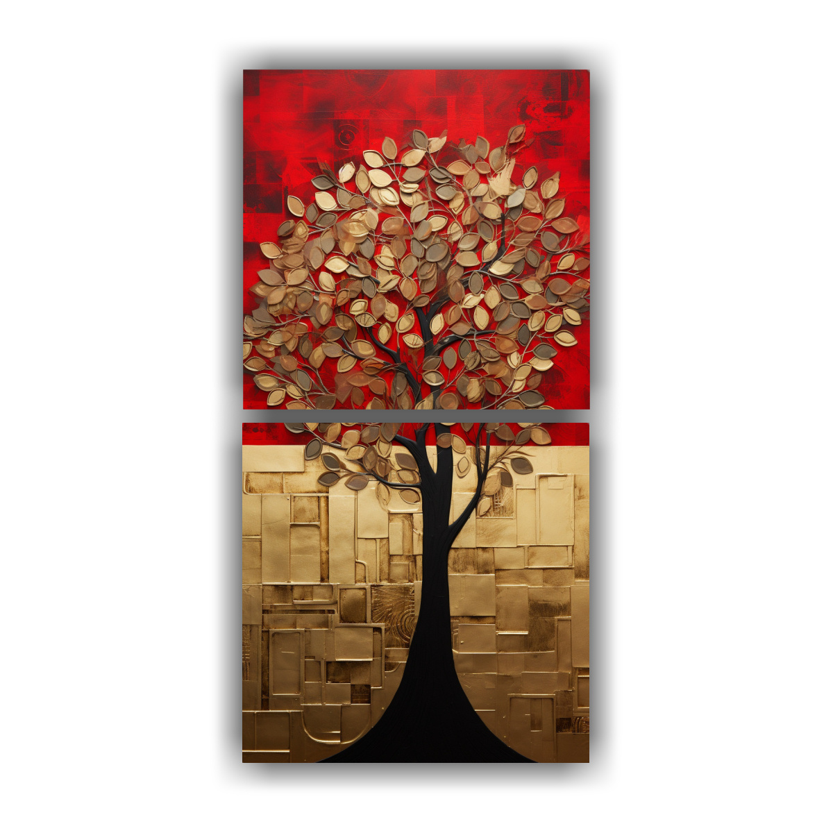 Conjunto 2 Pinturas De Pared Innovadoras Árbol En Rojo Y Dorado