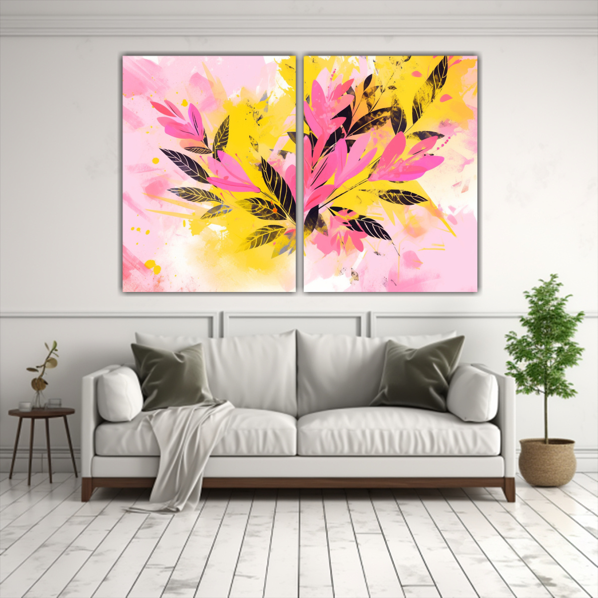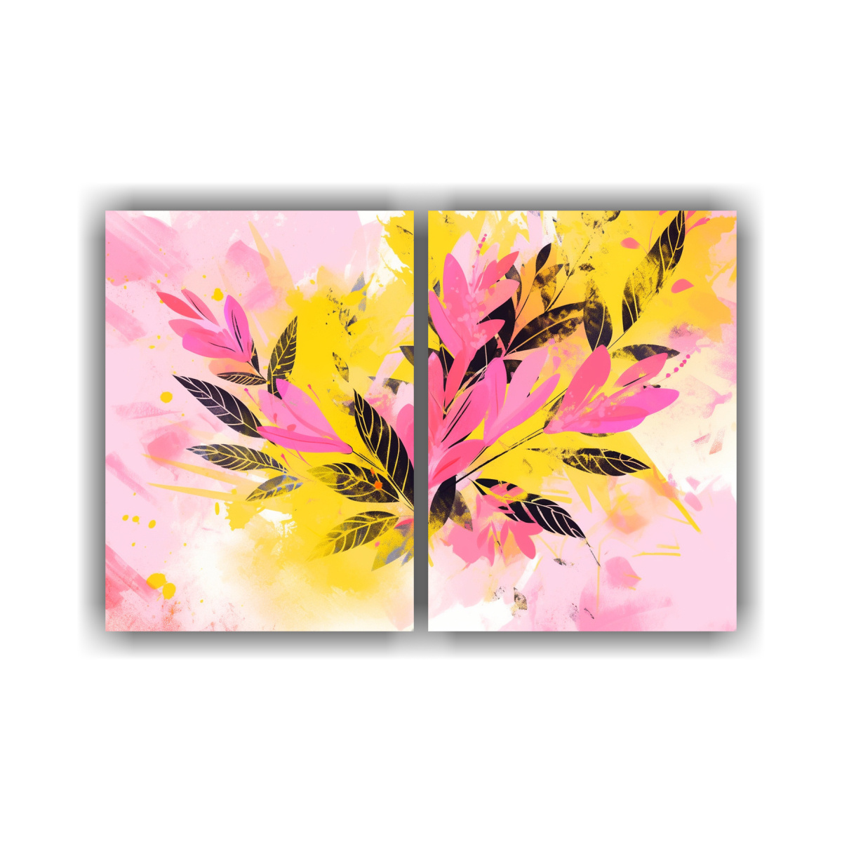 Conjunto 2 Telas En Bastidor Vanguardia Brillante Amarillo Y Rosa Atmosfera Neonoir Estilo