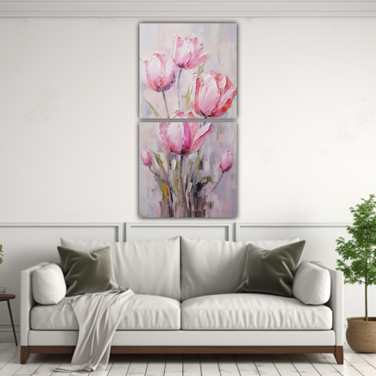Conjunto 2 Telas Estilo Galería Enigmático De Tulipanes Rosados En Lienzo Decoración De Cuadros