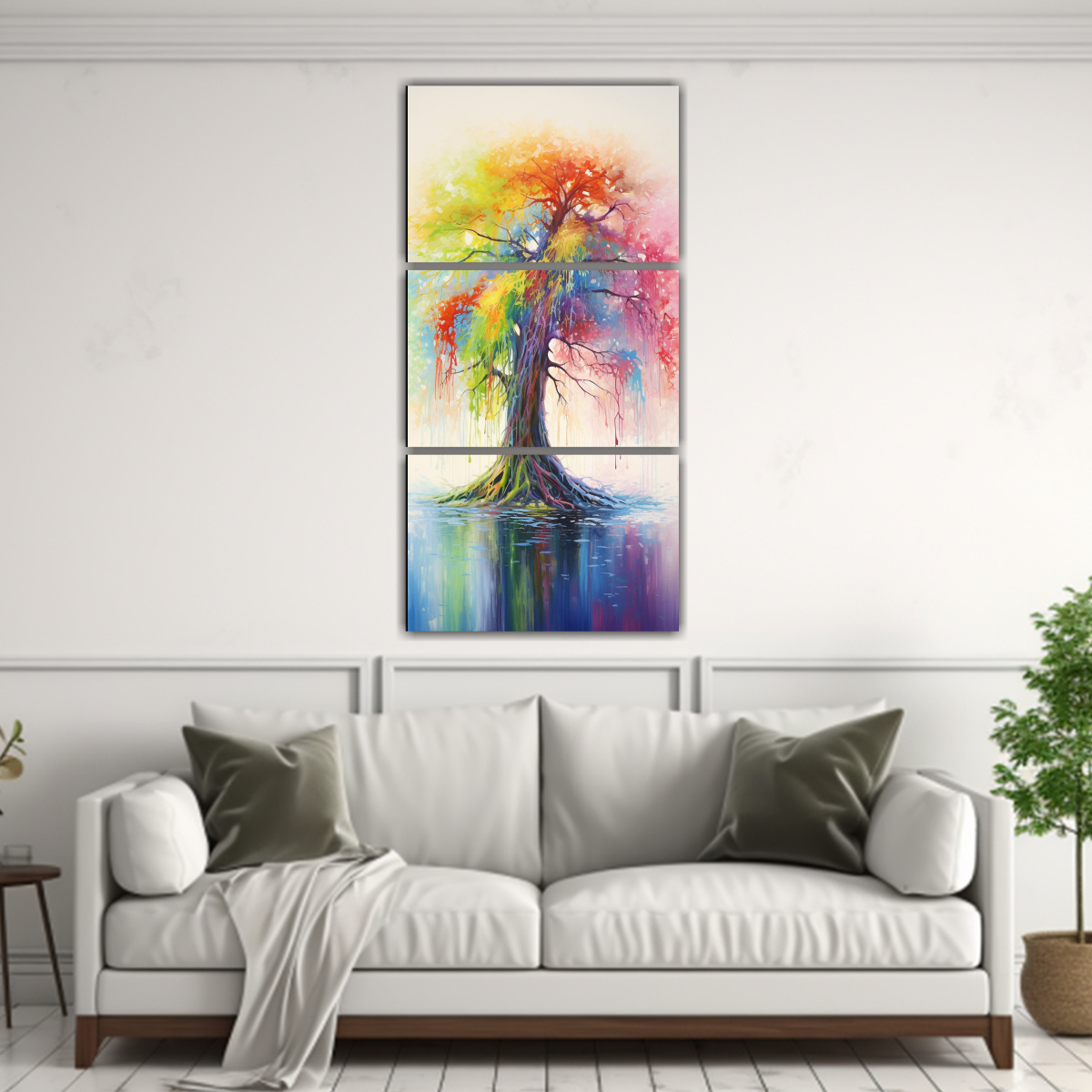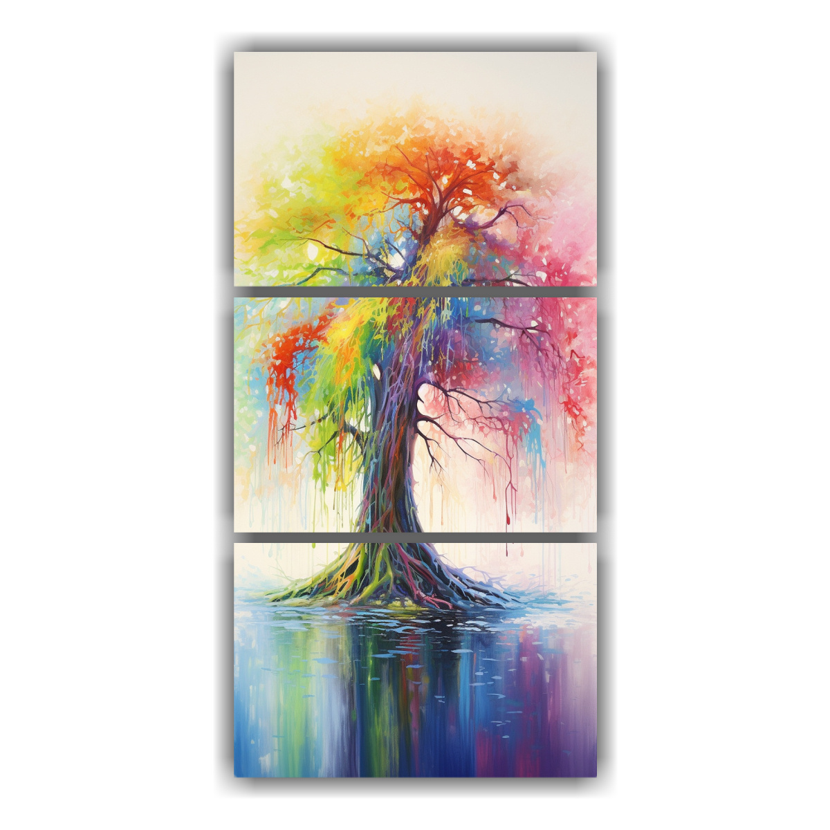 Conjunto 3 Cuadros Abstractos Colores Vibrantes Árbol Sauce Arcoíris