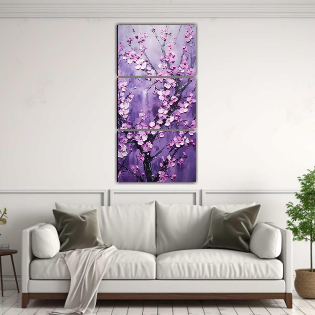 Este conjunto de cuadros estilo galería con flores de cerezo morado en lienzo se vería perfecto en un dormitorio o sala de estar con una decoración moderna y minimalista Combínalo con muebles en tonos neutros como beige o gris, y agrega algunos detalles en dorado para darle un toque elegante Coloca los cuadros juntos en una pared vacía para crear un punto focal impresionante