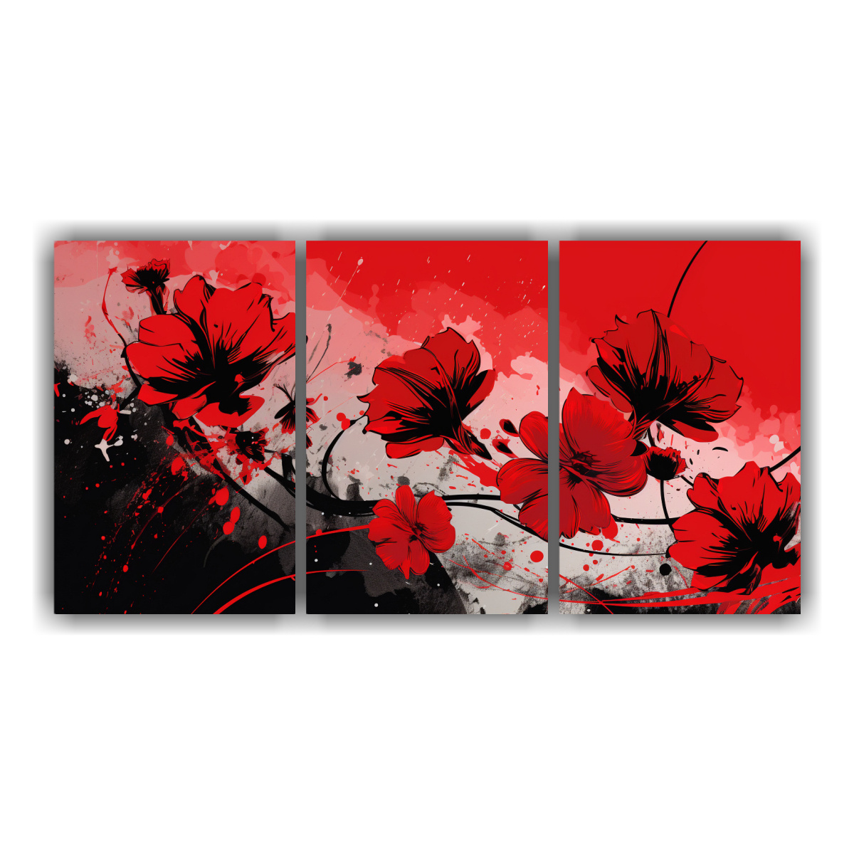 Conjunto 3 Cuadros Fotografía Vitalidad Rojo Y Negro, Atmósfera Neonoir, Estilo Decorativo.