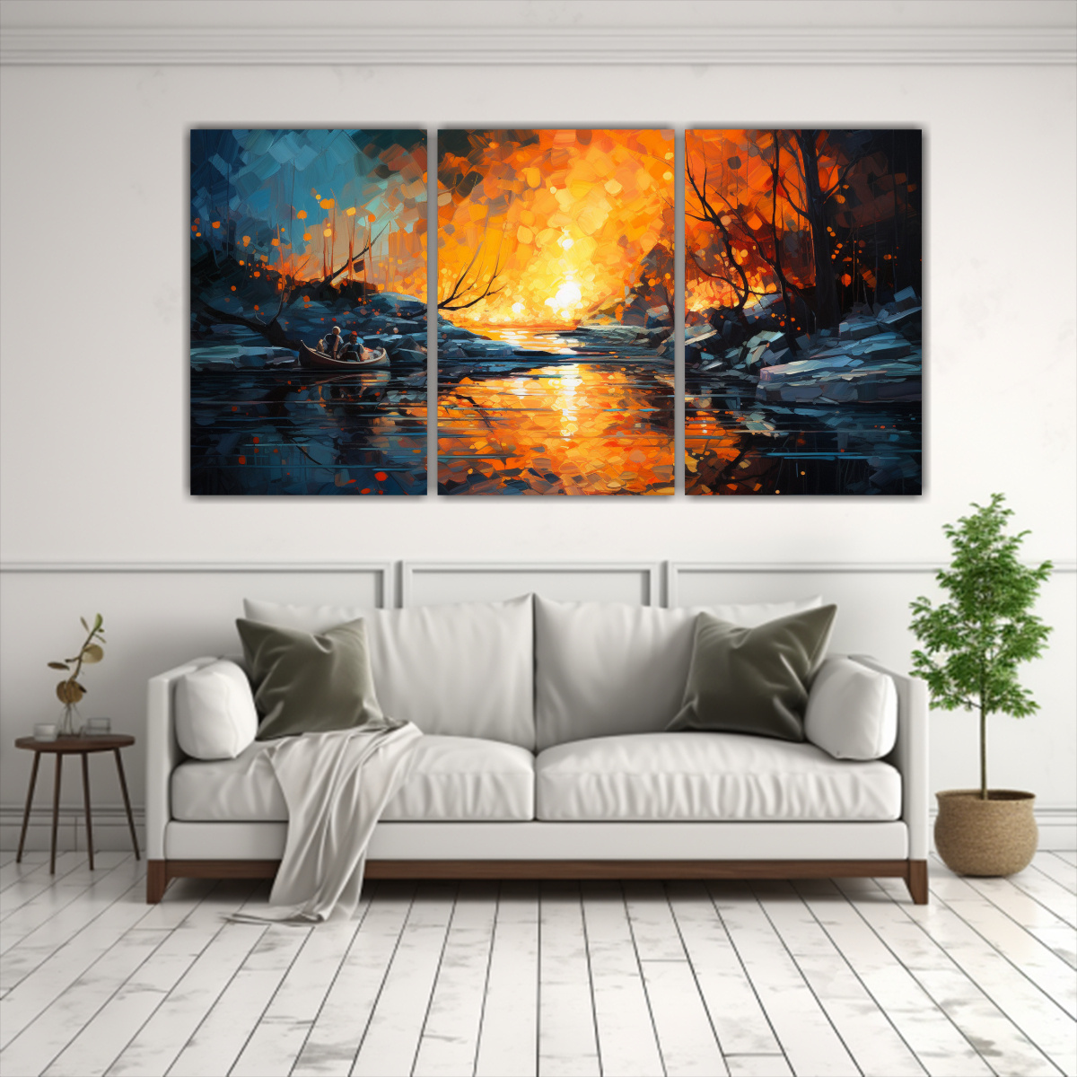 Conjunto 3 Cuadros Regalo Abstracto Naranjas Intensas Y Azules Refrescantes Fusionándose En Un Ab