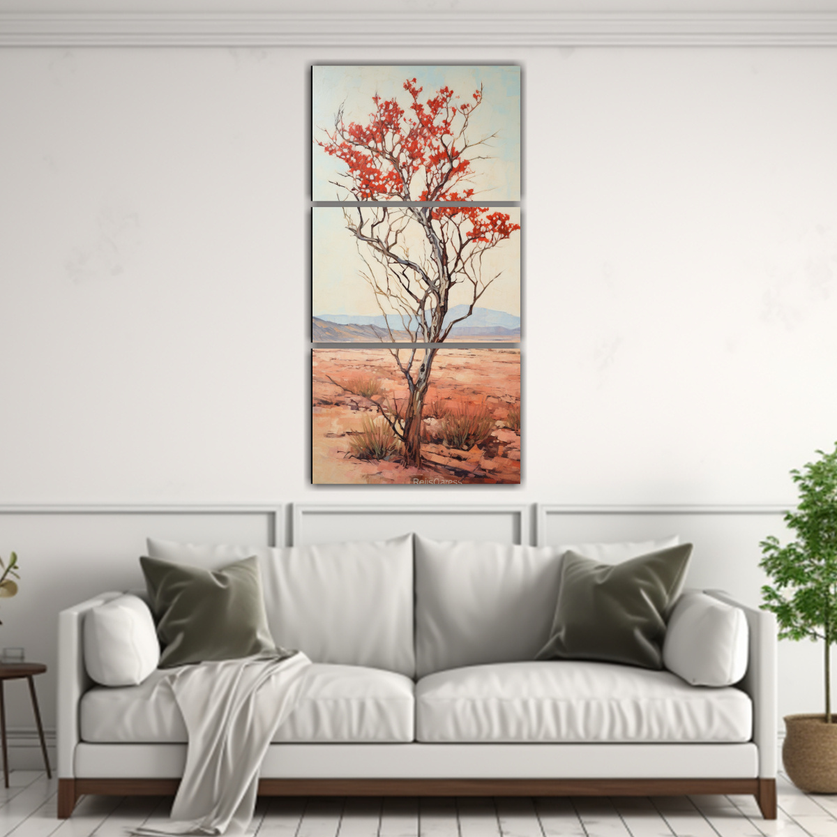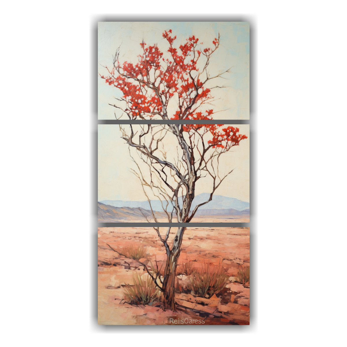 Set de 3 cuadros con diseño exclusivo de árbol Ocotillo en estilo abstracto con colores plateado, chocolate, gris, coral y carmesí Detalles en estilo Estilo óleo de alta calidad Renueva tu decoración con arte vanguardista