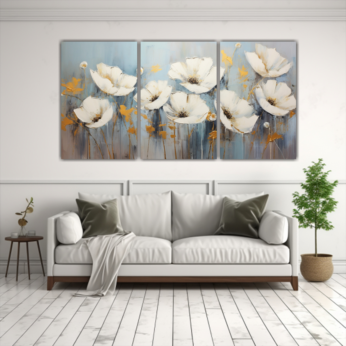 DecoCuadros te ofrece el Conjunto 3 Cuadros Vintage Enigmático Amapolas Blancas estilo Enigmatico pintura en lienzo con colores plateado, azul marino grisaceo, dorado y gris Crea un ambiente enigmático y sofisticado en tu hogar con estos diseños exclusivos Nuestros cuadros son impresos en tela de alta calidad y montados en bastidores de madera duraderos Además, te ofrecemos la mejor calidad del mercado a los precios más económicos Aprovecha nuestras entregas rápidas y gratuitas en Santiago y envíos express a todas las regiones