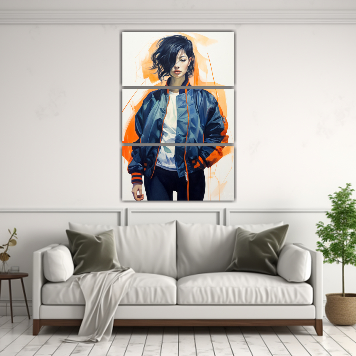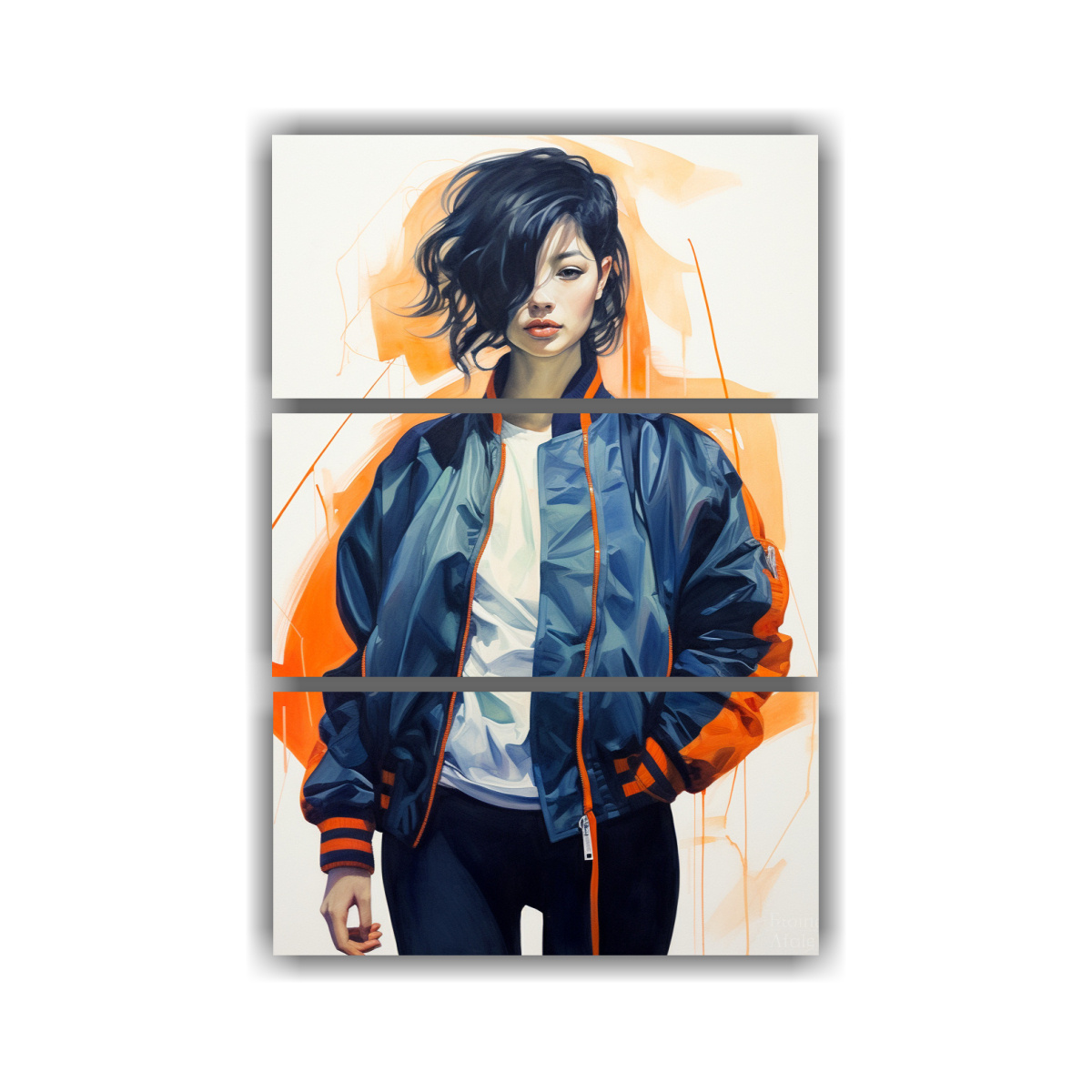 Este conjunto de cuadros Abstracto Chaqueta bomber azul marino con cremallera, forro de nylon naranja es perfecto para darle un toque moderno y sofisticado a tu sala de estar Colócalo sobre un sofá gris claro para resaltar los tonos azules y naranjas de la chaqueta Además, combínalo con cojines en tonos coral y amarillo claro para crear una armonía de colores ¡Atrévete a decorar con estilo y calidad!