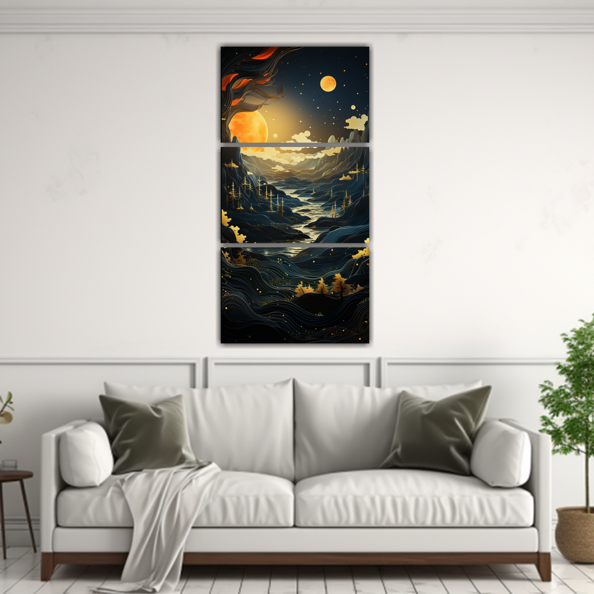 Este Conjunto 3 Lienzos Dibujo Fases lunares paisaje montaña noche dorado es perfecto para darle un toque de elegancia a tu sala de estar Colócalo sobre un mueble en tonos dorados o beige para resaltar su belleza ¡Sorprende a tus invitados con esta obra de arte exclusiva de DecoCuadros!