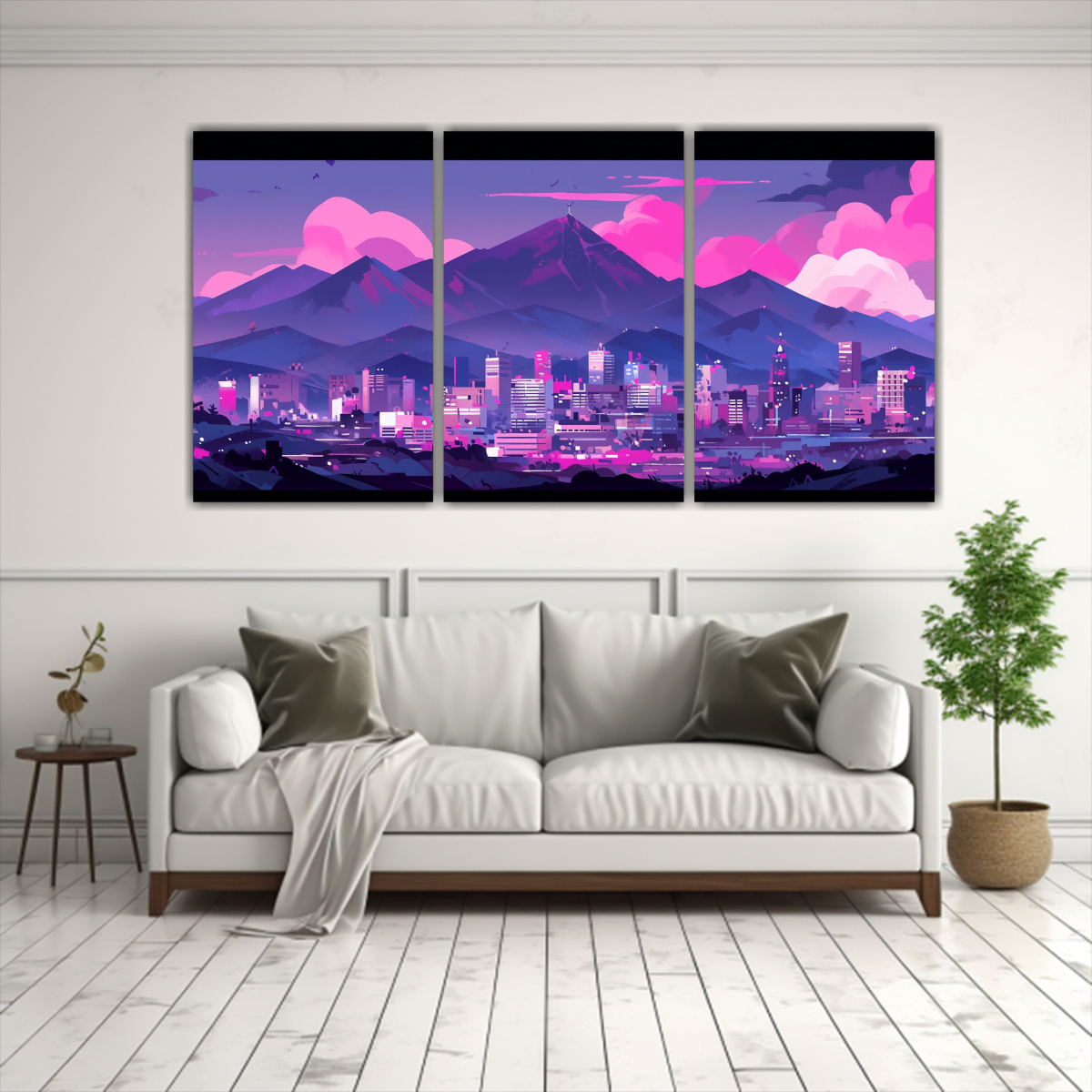 Este conjunto de lienzos en tonos morados y rosas neo es perfecto para decorar tu salón en Santiago Colócalos sobre un sofá gris para resaltar los colores, creando un ambiente acogedor y sofisticado Combínalos con cojines en tonos neutros para un estilo equilibrado y moderno