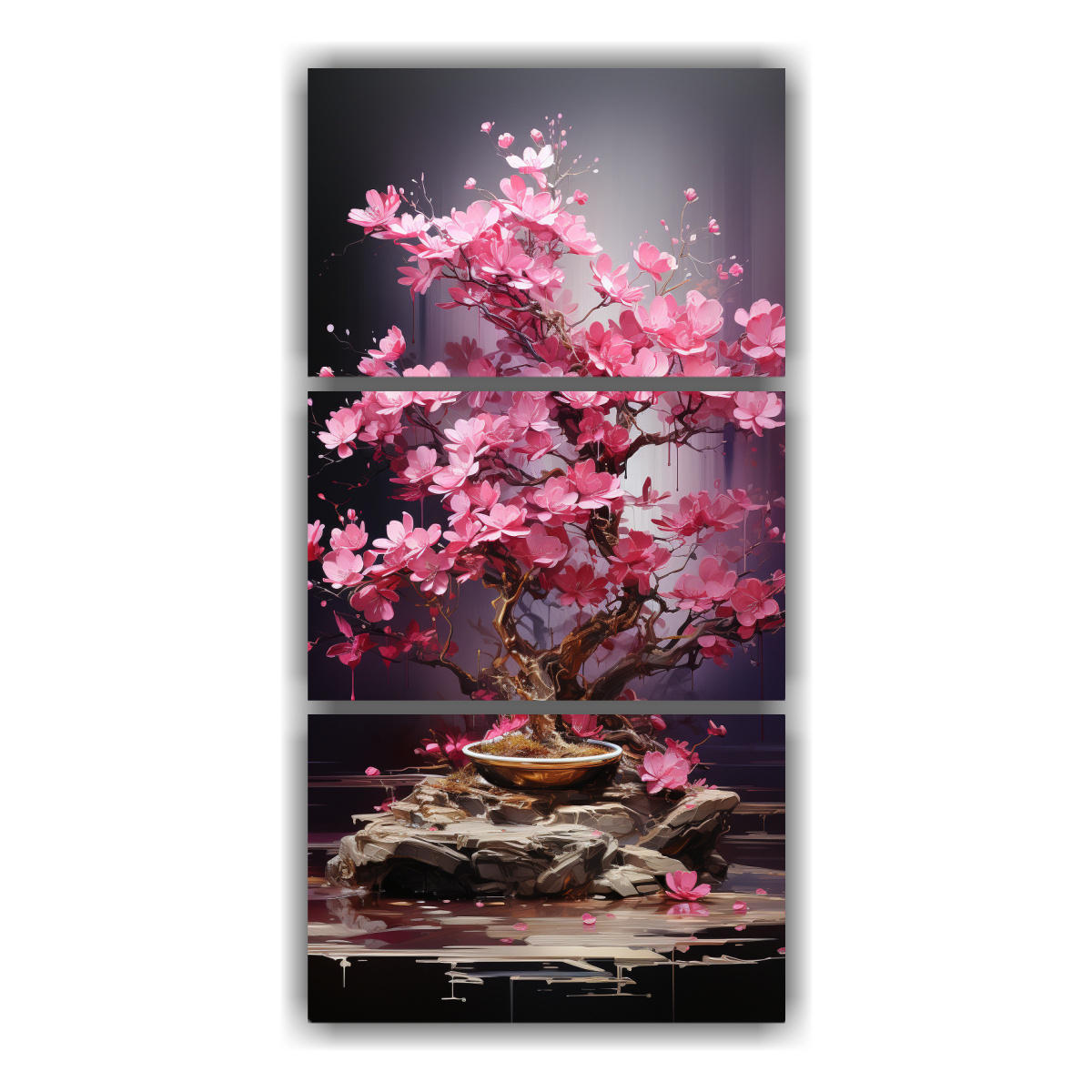 Conjunto 3 Lienzos Tela Diseño Perspectiva Fucsia Bonsái Colores Oro