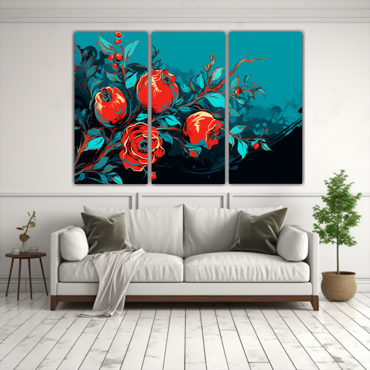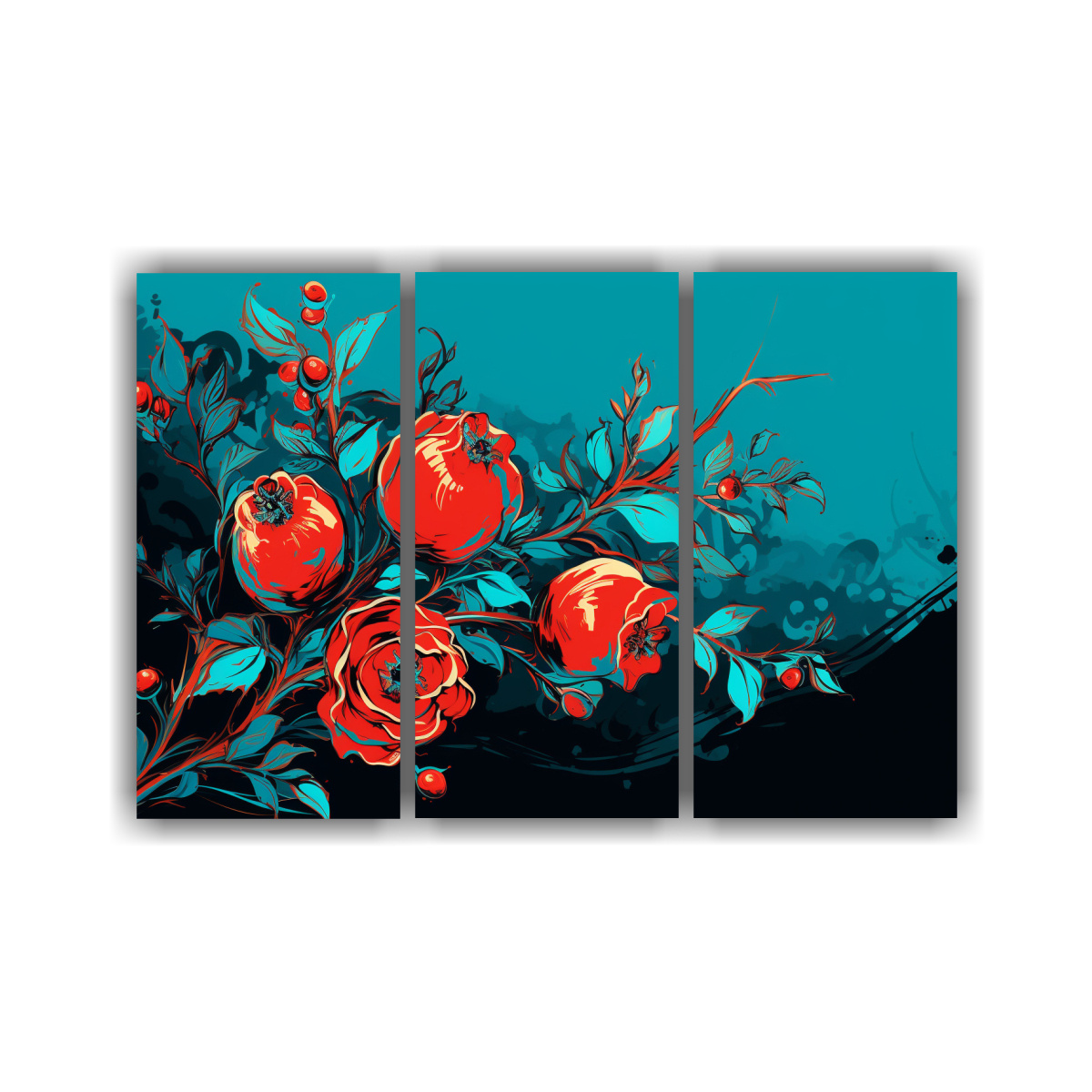 Conjunto 3 Lienzos Tela Minimalista Granado En Rojo Y Turquesa Neonoir