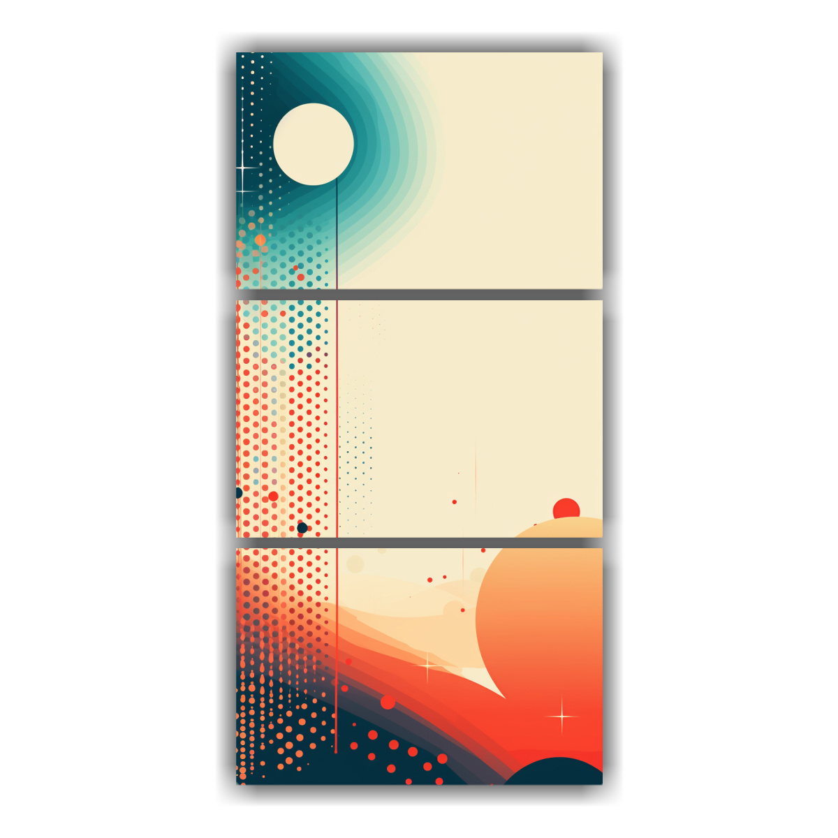 DecoCuadros tiene los mejores cuadros decorativos impresos en tela de alta calidad con bastidores de madera Descubre nuestro Conjunto 3 Lienzos Tela Patrón Intenso Minimalismo Retrato con puntos semitonos en colores Coral, Azul Marino grisaceo, Beige, Turquesa, Plateado, Menta y Lila Diseños exclusivos y entregas rápidas