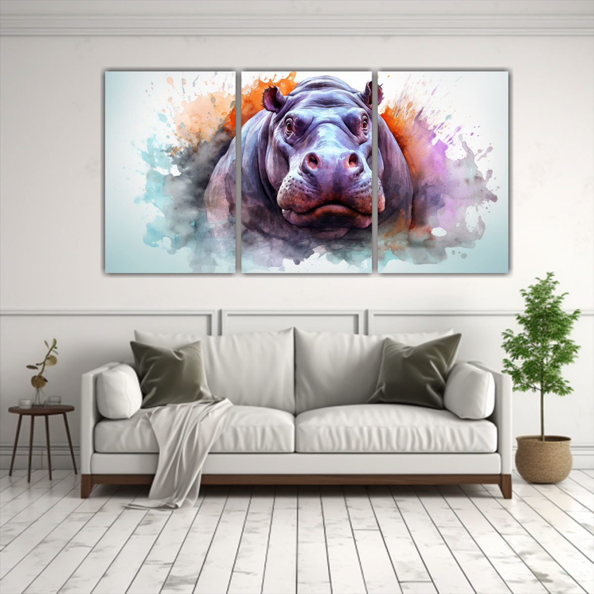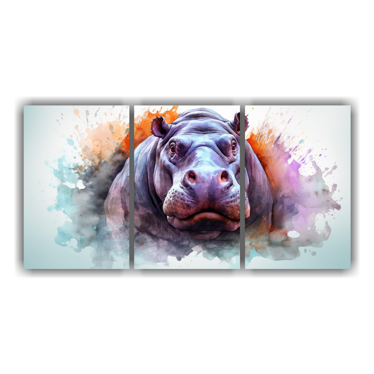 Conjunto 3 Telas Bastidor Calma Hipopótamo Acuarela Colorida