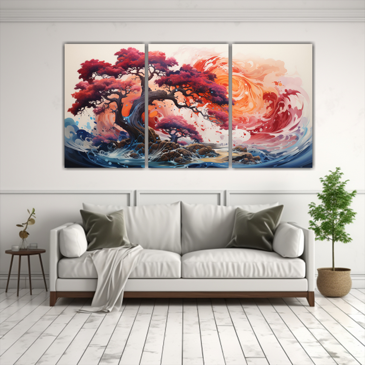 Este conjunto de 3 telas es ideal para decorar tu sala de estar Puedes colocarlas juntas en una pared vacía o separarlas y distribuirlas en diferentes áreas de la habitación Combínalas con muebles de tonos grises y beige para crear un ambiente sofisticado y moderno El Árbol de Pino en Colores Rojo y Azul le dará un toque de color y vida a tu espacio, convirtiéndolo en un lugar acogedor y lleno de estilo