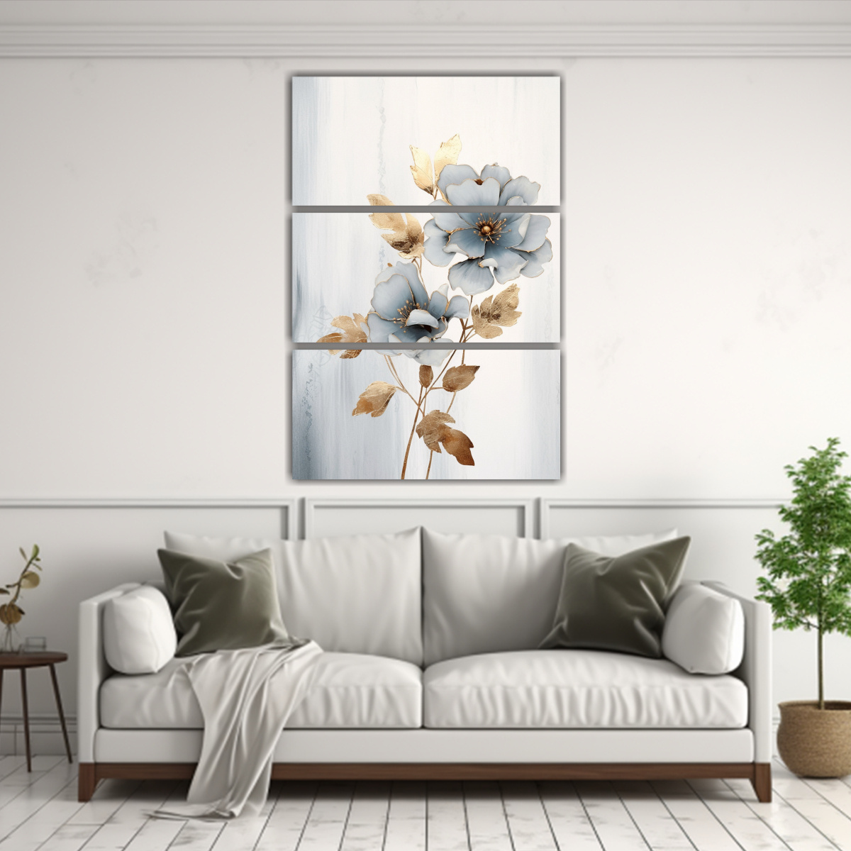 Conjunto 3 Telas Bastidor Moderno Florales En Tono Gris Azulado